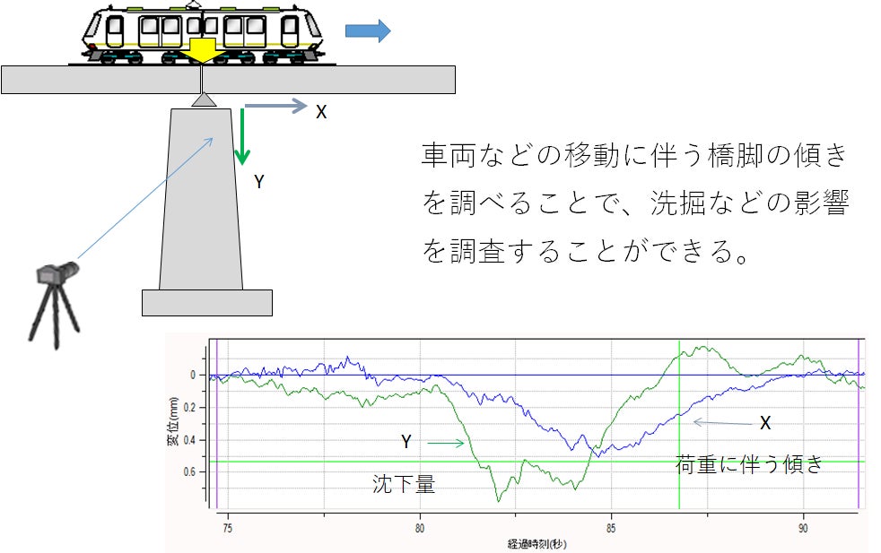 接近が難しい高所の部位に対し、計測器や測定ターゲットを設置することなく、遠方(桁下部~50m離れ)から望遠レンズを搭載したデジタルカメラで動画撮影を行います。動画像解析ソフトにより鉛直・水平変位を算出することで、橋桁や床版のたわみ・振動、支承部の挙動を把握し、橋梁の健全性を確かめることができます。