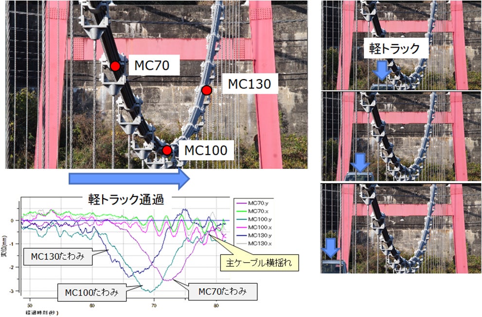 ・計測⽅法について、接触式変位計等では構造物に計測用機材を取り付けて計測する必要があったところ、本システムではデジタルカメラで遠方から撮影した動画で解析をおこなうため、構造物に対して非接触での計測が可能です。