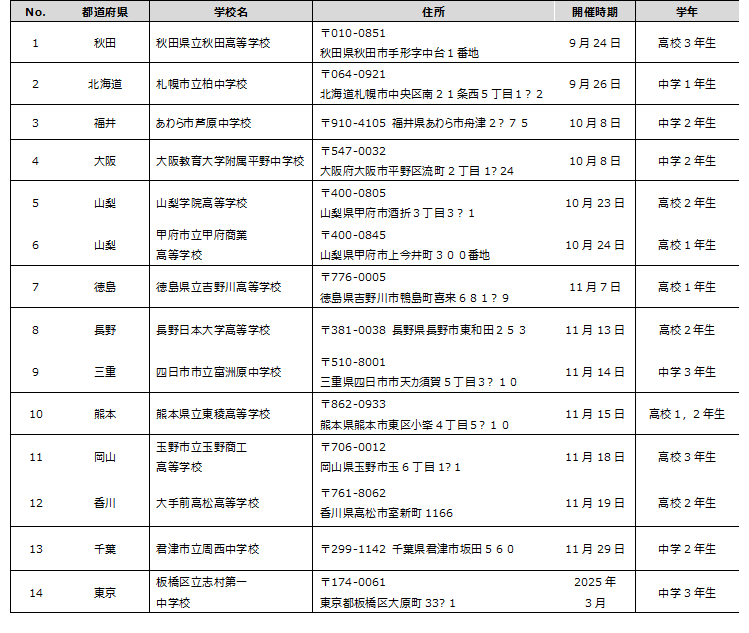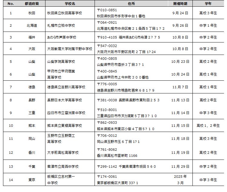 なお、各校での実施スケジュールを下部に記載いたします。各校での実施が近づきましたら当該地域の報道機関各社様へは順次、ご取材案内をお送りさせていただきますので、ぜひ当日のご取材についてご協力いただきますようお願い致します。※送付を希望する報道機関の記者の方は、復興庁出前授業 PR事務局までご連絡をお願いいたします。