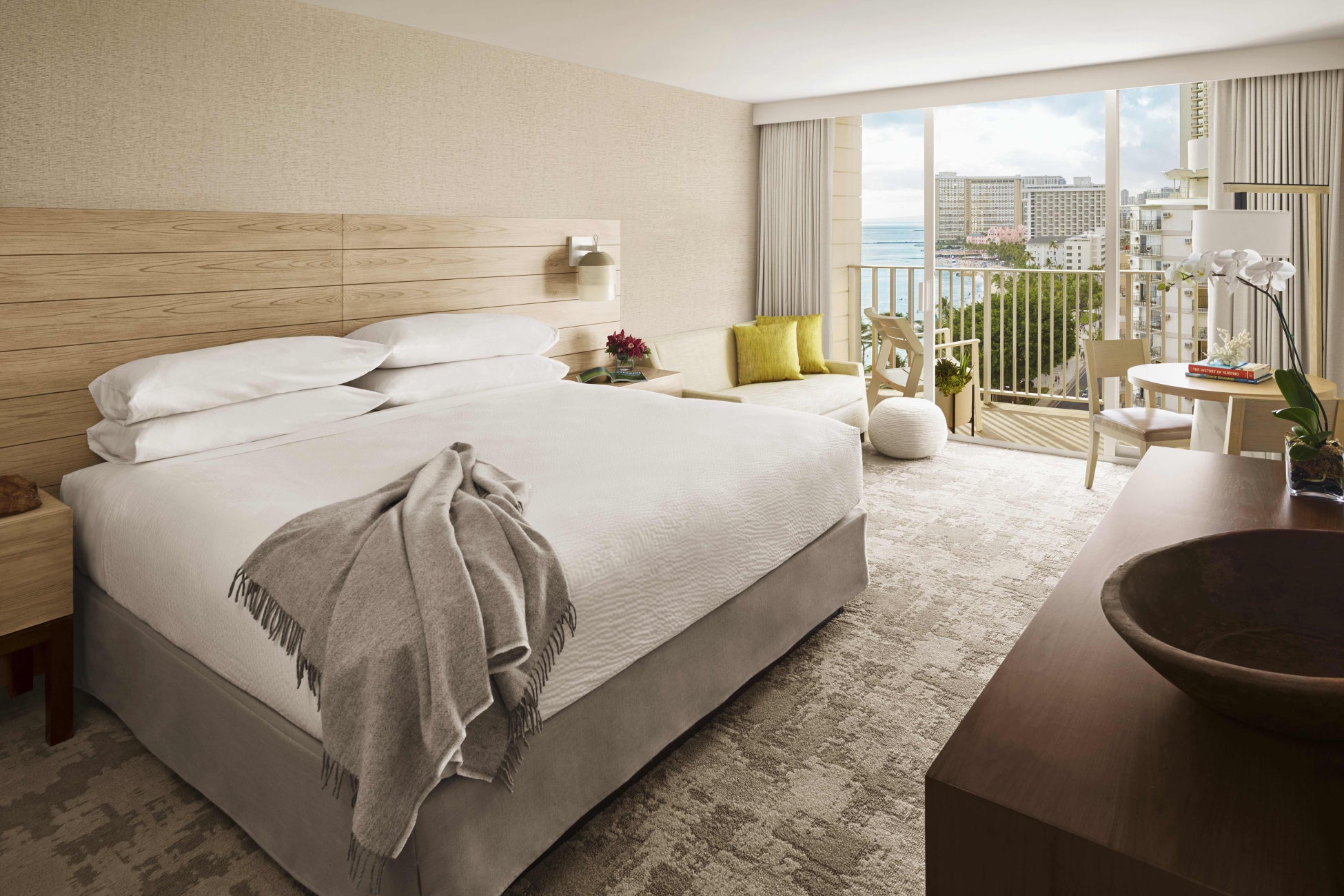 ワイキキビーチ、青い海、街並み、山が織りなすビーチフロントに位置するホテルならではの美しい景色をお楽しみいただけるお部屋です。(パーシャルオーシャンビューの料金でご利用いただけます)