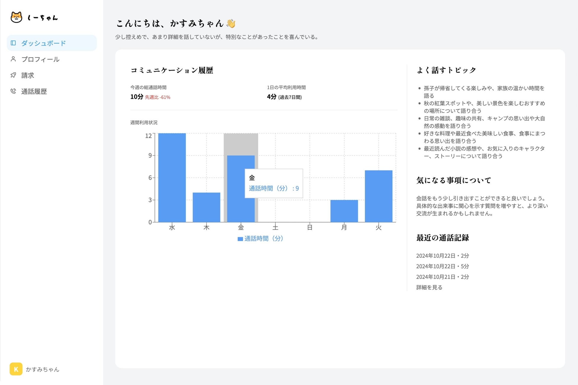 「しーちゃん」の特長は、AIによる高度な言語処理を活用し、ユーザーのニーズに応じた柔軟な対話ができる点です。日常会話から、悩み相談、生活のアドバイスまで、幅広い話題に対応することができ、まるで実際の人間のように自然な会話が可能です。特に、シニア世代の方々や一人暮らしの方々に向けて、孤独感の軽減や認知機能の維持に貢献することを目指しています。
