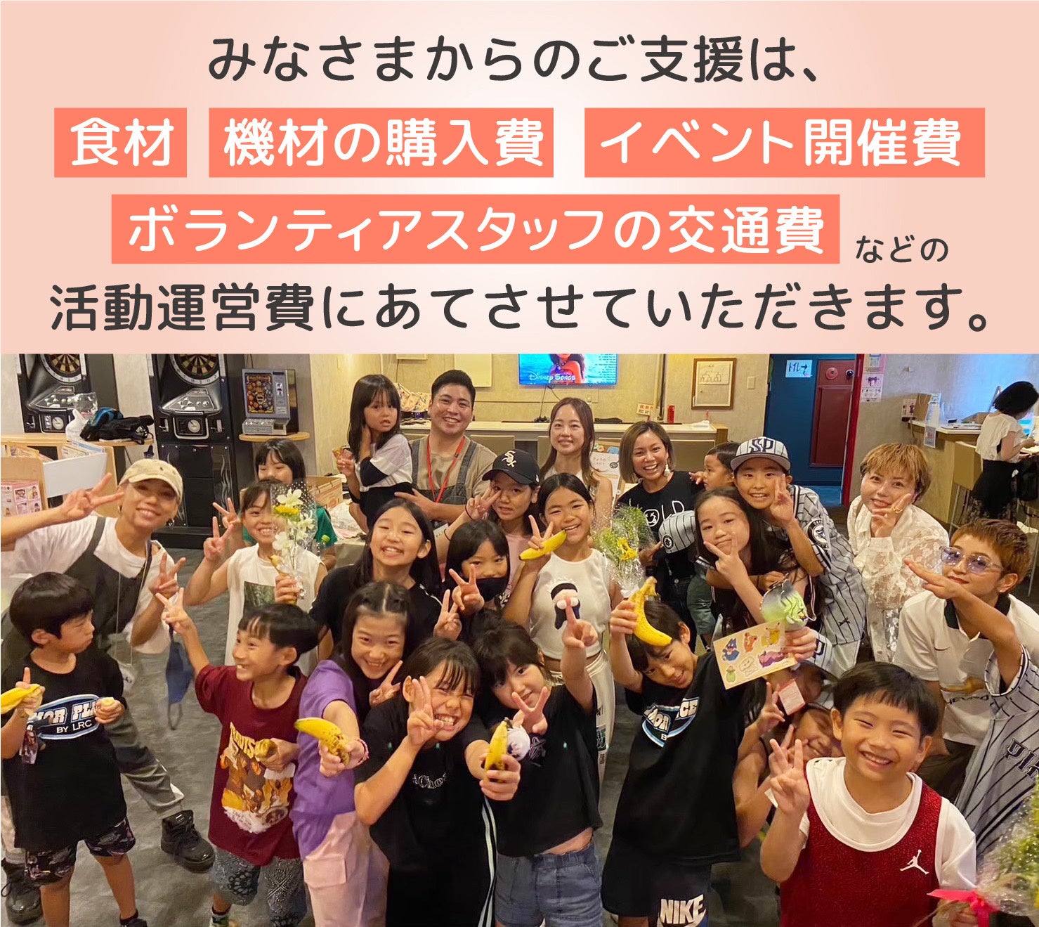 みなさんにご支援いただいた資金は食材費、お弁当箱、割り箸などの消耗品や子どもたちが遊ぶおもちゃ、折り紙、文房具などの購入費、家賃、光熱費、交通費、イベント開催費などの活動費に充てられます。