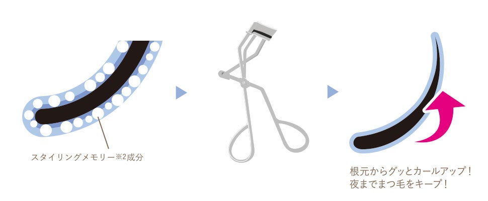 POINT1:スタイリングメモリー※2成分がまつ毛の上に膜を形成し、ビューラーのカールアップを助け、記憶します。