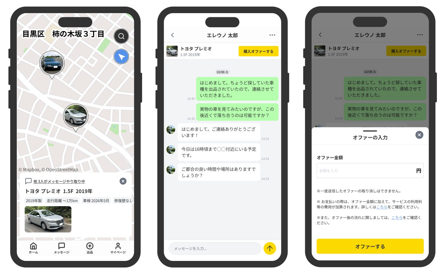 車を買いたい個人や事業者は、アプリのマップから気になる車を探し、興味を持った車のオーナーとチャットでやり取りしながら、実際に落ち合って現車の確認をします。