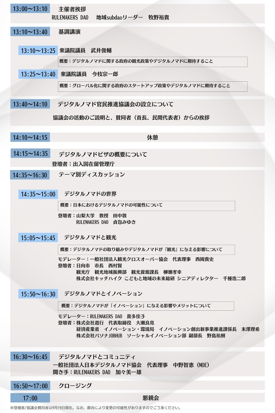 デジタルノマドシンポジウムの詳細についてはPeatixでご確認ください。なお、デジタルノマド官民推進協議会の詳細は同シンポジウムにてご案内する予定です。