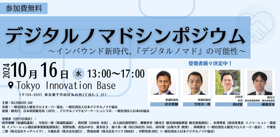 また、デジタルノマド誘致の促進のため、東京・有楽町にて、2024年10月16日に以下の要領で「デジタルノマドシンポジウム」を開催致します。本シンポジウムでは、デジタルノマドビザの制度化にご尽力頂いた武井俊輔衆議院議員、今枝宗一郎衆議院議員に、デジタルノマド誘致への期待について基調講演を頂いた後、ご賛同いただく首長からもご挨拶をいただき、デジタルノマド官民推進協議会のご紹介および設立の宣言を行います。また、デジタルノマドビザの概要について出入国在留管理庁からご説明頂き、続くパネルディスカッションでは、「デジタルノマド」「観光」「イノベーション」の各テーマごとに、首長、省庁、民間事業者らにご登壇頂きます。