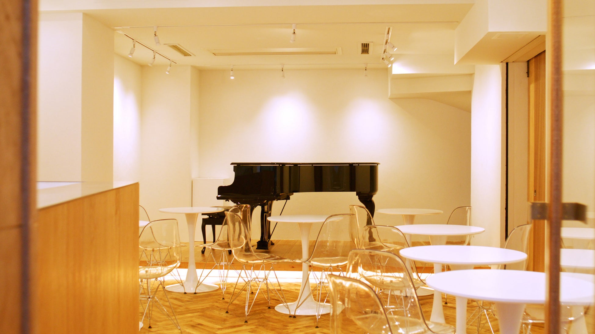 THE HARMONYSTは1階と2階と分かれ、1階はギャラリー&ミュージックカフェとして展開、全面に絵の展示が可能で、後方にはグランドピアノ付きのステージを設置しています。