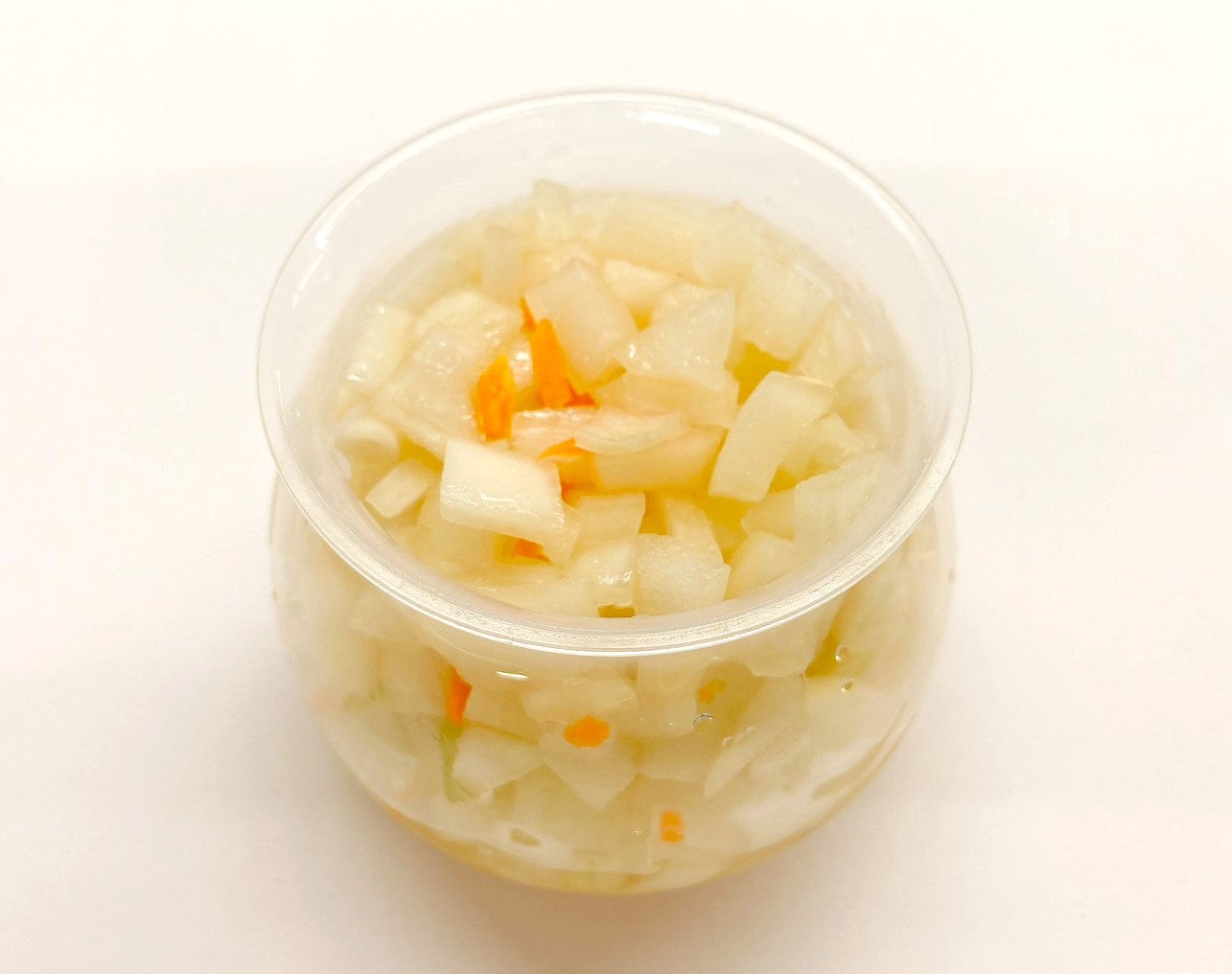 らっきょうのイメージからかけ離れず、新しいまろやかな風味を実現。国産玉ねぎを使用したカレーの副菜として、和風ピクルスのような新しい一品です。