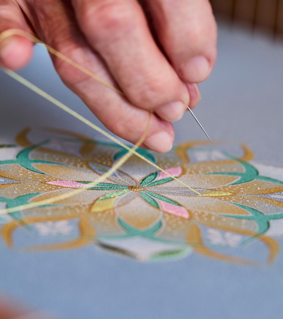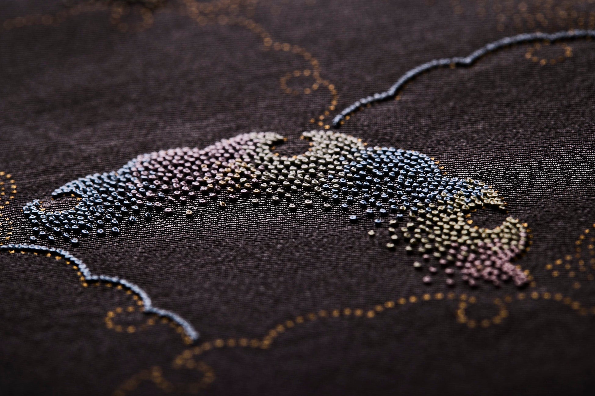 金銀箔や金泥は、豪華で格式高さを表現する技法として、古くから使われていますが、繊細な刺繍と組み合わせることで、金銀箔や金泥が醸し出す光沢と、緻密な糸使いによる刺繍の美が融合し、上品でありながらも豪華で格式高い文様を表現します。