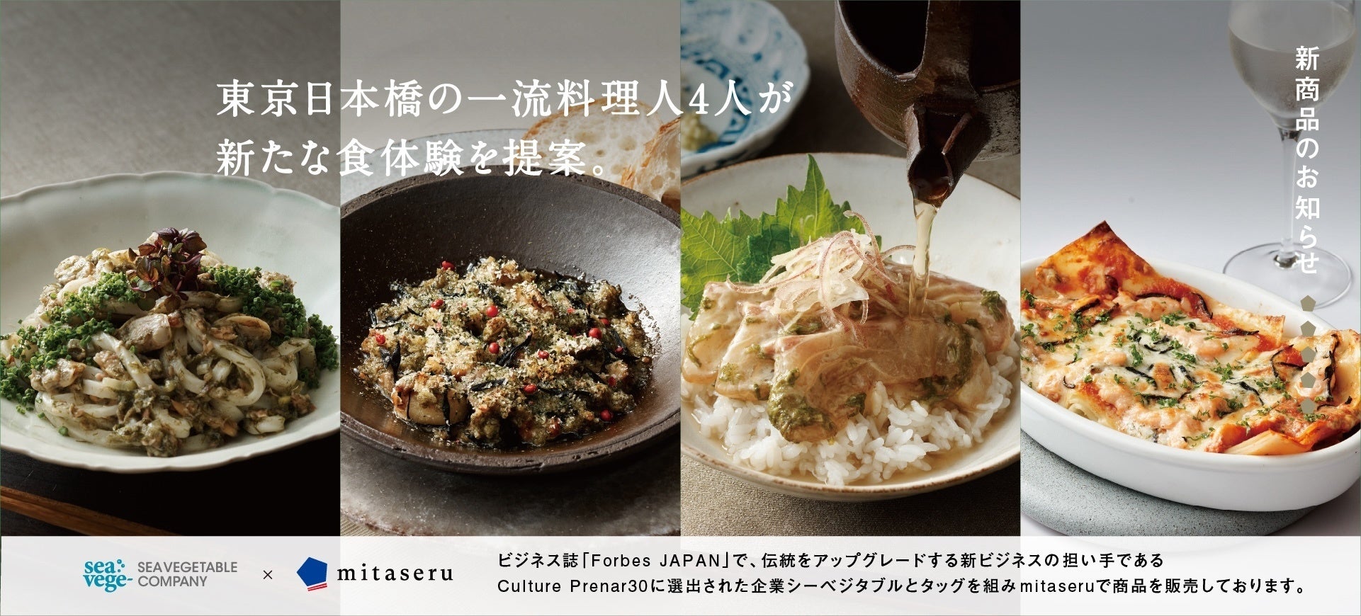三井不動産グループの株式会社mitaseru JAPAN(ミタセル ジャパン)(本社:東京都中央区、代表取締役:松本大輝、以下「mitaseru JAPAN」)は、海藻の研究・栽培・加工・料理開発などを一貫して行う合同会社シーベジタブルとコラボレーションし、東京・日本橋にある名店の一流料理人4人が手掛ける、海藻を使ったお取り寄せグルメ新商品3点を9月6日(金)より「mitaseru」オンラインストアにて発売中です。さらに、10月中旬に新商品1点を加え、合計4つの新商品を発売します。また、日本橋三越本店にて9月25日(水)から10月8日(火)まで開催中の特別イベント「EAT & MEET SEA VEGETABLE」では、このうち3商品を10月2日(水)より店頭販売し、海藻の新たな食体験を提案いたします。