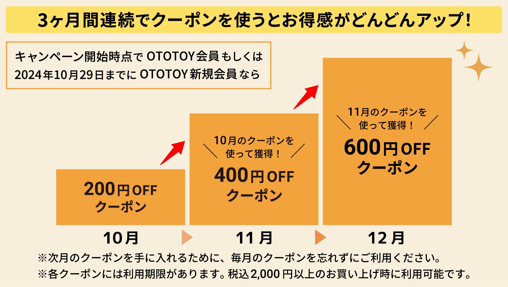 毎月のクーポン:当月のクーポンを利用すると、翌月のクーポンが受け取れます。クーポンは月末で期限切れとなります。未使用の場合、翌月のクーポンは配布されません。