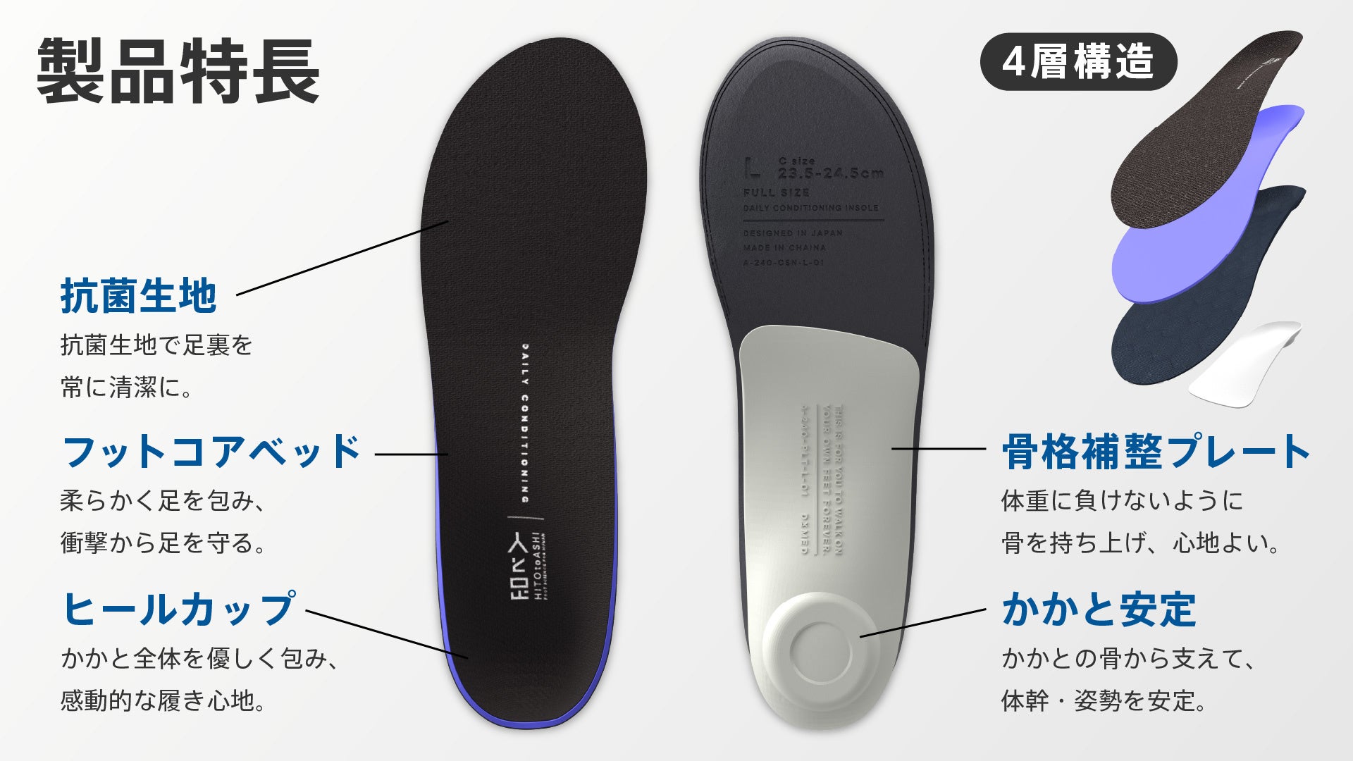 当社が独自に開発したインソールの最大の特長は「足の機能性を引き出すための、汎用性の高い根幹理論を活用」しているため、あらゆるターゲットニーズに応えられる設計が施されている点です。