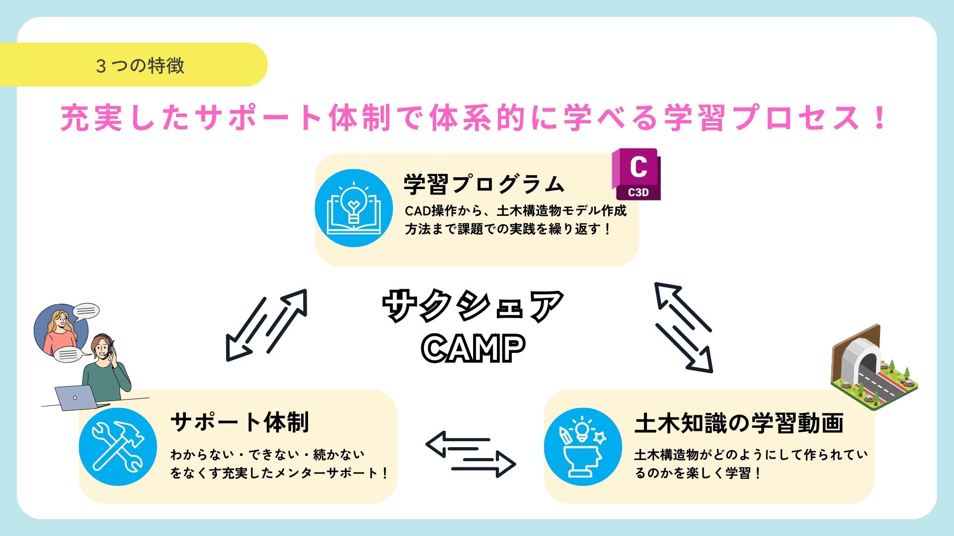 「サクシェアCAMP」は、土木技術者が実務で直面する課題を解決できるよう、以下の革新的な学習メソッドを採用しています。