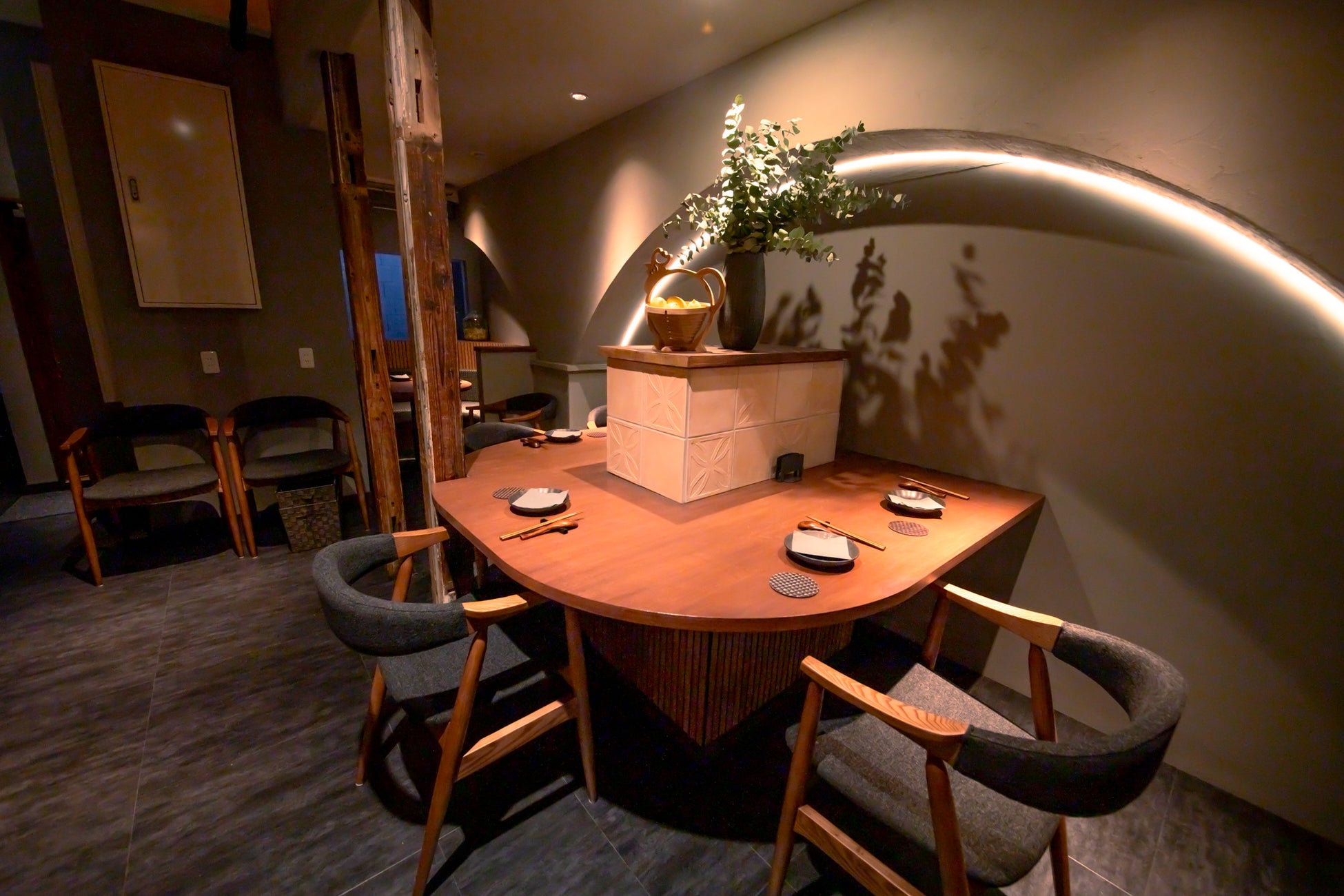 「グリーン基調はデザイナーさんのアイデアです。最初は僕の意見に合わせてくれたのですが、 “それじゃあなたにお願いした意味がない。工期も予算も気にしないで、やりたいようにやってください” と言って、結果的にすごくかっこよくなりました。料理も一緒で、万人受けする味じゃなくても、確かなメッセージとストーリーがあって、自信を持って作った料理なら、出していいと僕は思うんです。その自信が職人のかっこよさだし、僕がリスペクトする部分でもあるので」