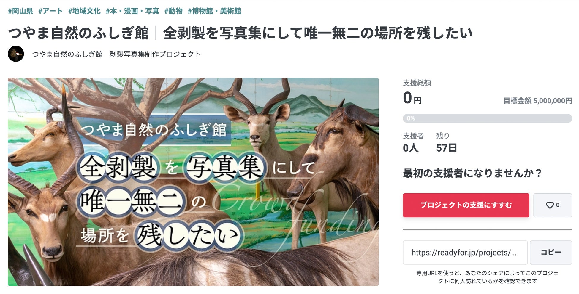 【唯一無二の場所、つやま自然のふしぎ館】全剥製800体の写真集制作と保存のため、500万円を目標にクラウドファンディング開始