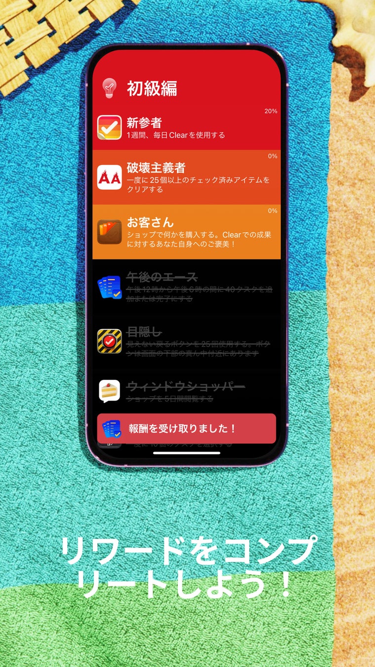 今回、ぜひともみなさんに紹介したい機能のひとつが「リワード」です。特定の条件をクリアするとClear内で使用できるテーマやアプリのアイコンがアンロックされます。初級編・上級編に分かれているので、ぜひコンプリートを目指してくださいね。