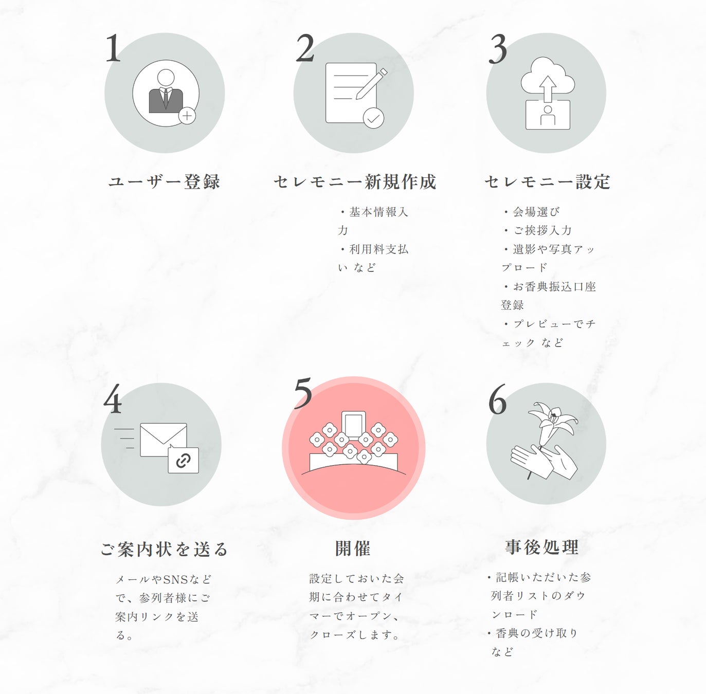 主催者様(喪主様、葬儀社様、企業総務部ご担当者様等)は、テンプレートから会場を選び、ご遺影や写真、挨拶文などを入力するだけで簡単にセレモニー会場や、参列者様に配布するご案内ページが生成されます。