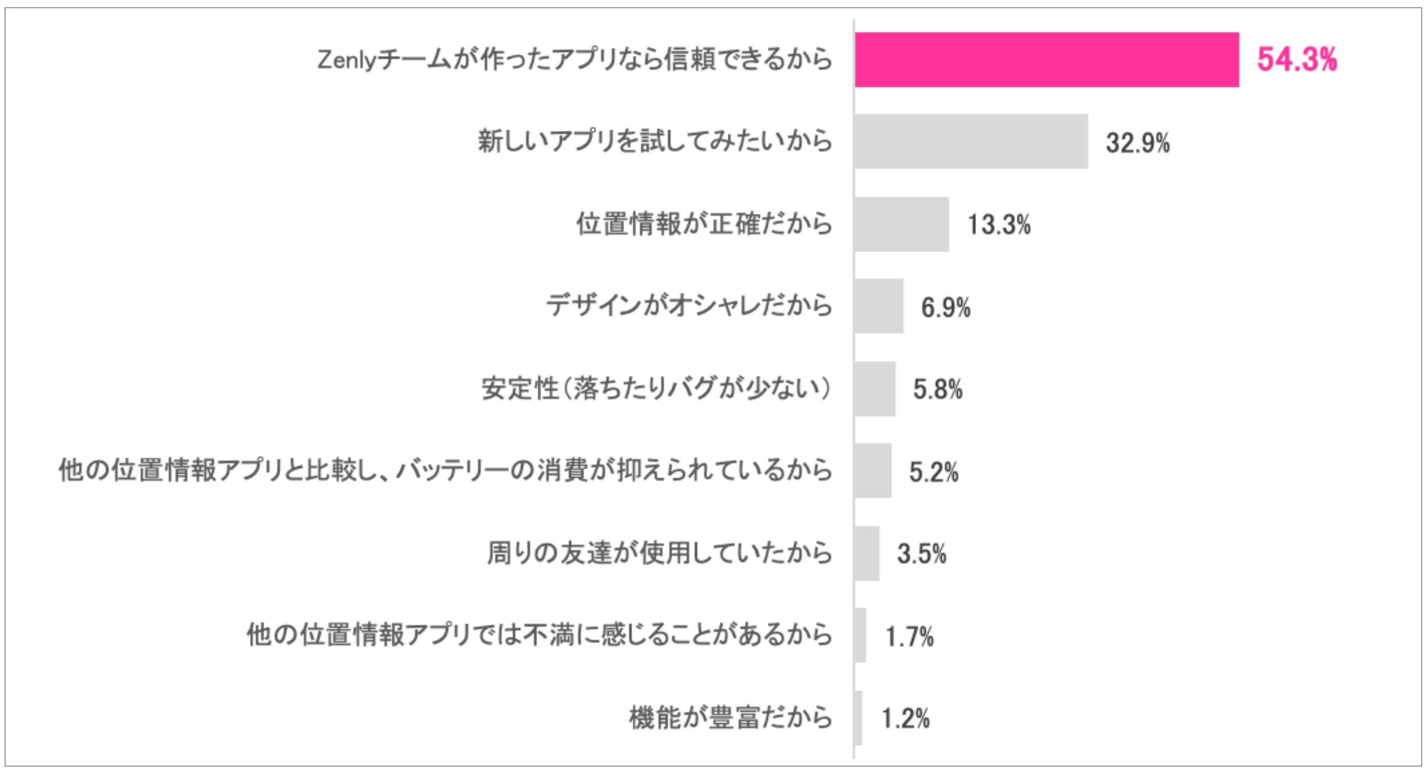 「Bump by amo」を使ってみたい・使っている人に理由を聞いた所、「Zenly」チームが作ったアプリなら信頼できると回答した方が、54.3%で、過半数を超えており、「Zenly」に対する信頼度が厚いことがうかがえる。