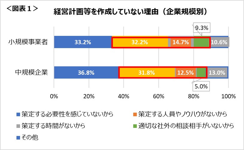 それによると、小規模企業の約5割、中規模企業の約3割が経営計画または事業計画(経営計画等)を策定していません。