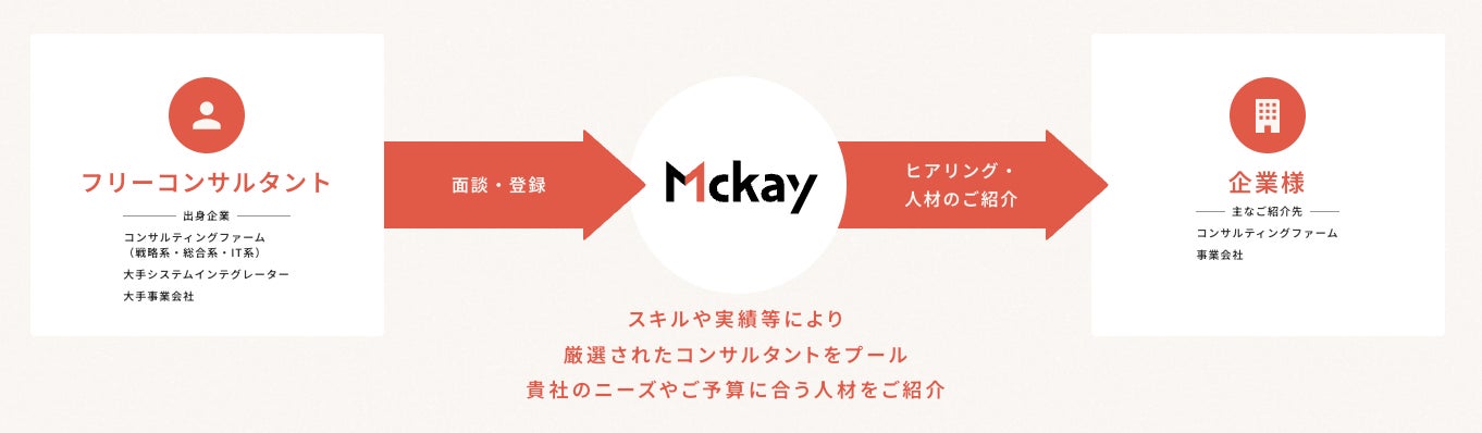「Mckay(マッケイ)」は、デジタル領域に特化したスキルや実績等を基に厳選された経験豊富なフリーコンサルタントと、コンサルタントに課題解決を依頼したい企業を繋げる案件マッチングサービスです。