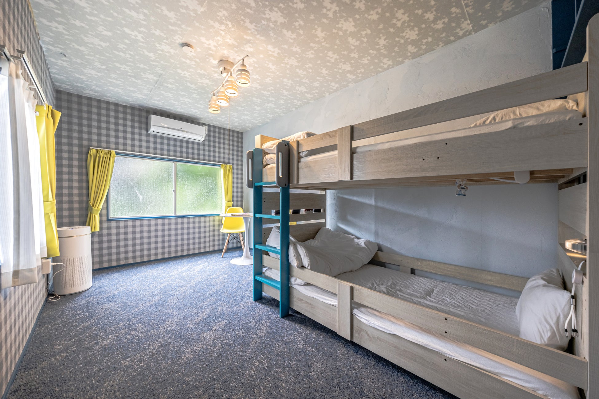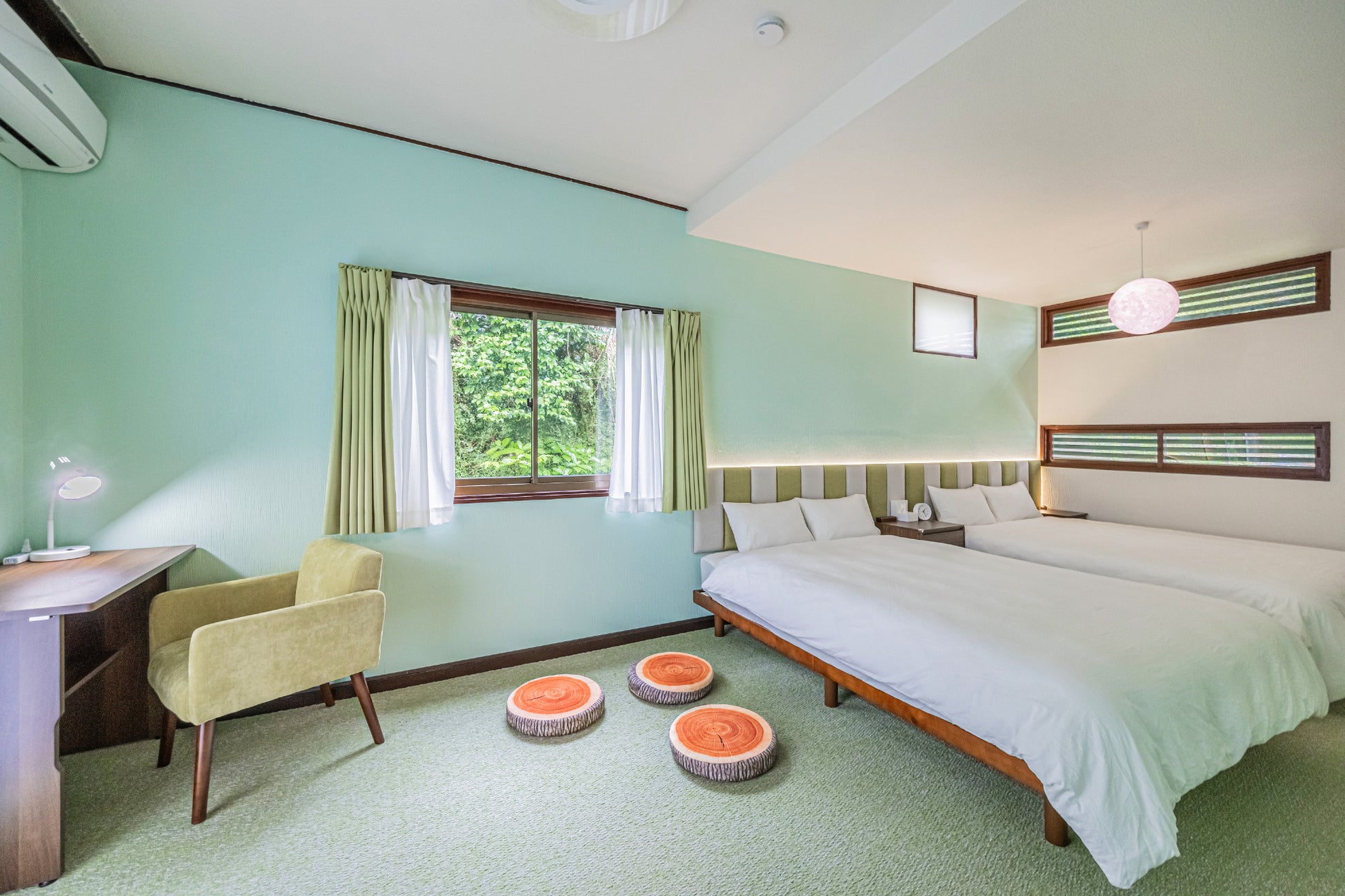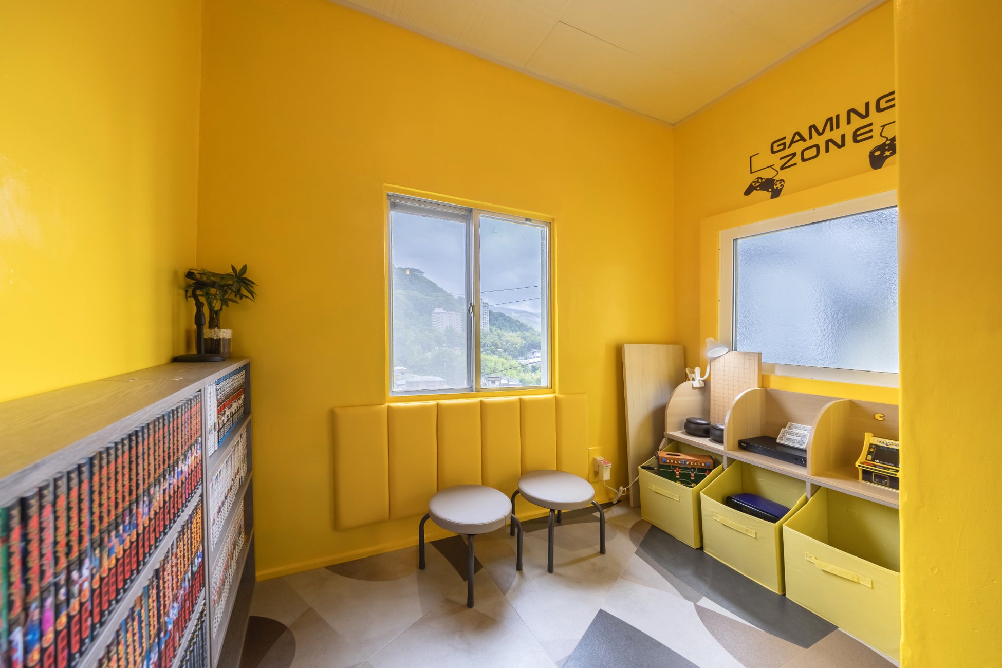 寝室は、2段ベッドを配した「青の寝室」、ダブルベッド2台とPCデスクを置いた「緑の寝室」のほか、畳敷きの和室があります。和室にはおもちゃやクッションマットを備えたキッズルームも併設。テレビゲームや漫画を備えた娯楽室もあります。