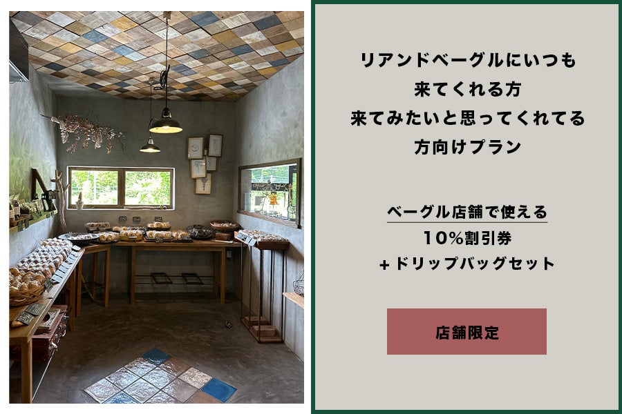 リアンドベーグルをいつもご利用いただいているお客様や、これから訪れてみたいと思っている方向けのリターンです。支援者様に感謝の気持ちを込めて、特別な割引券とドリップバッグをお届けします。