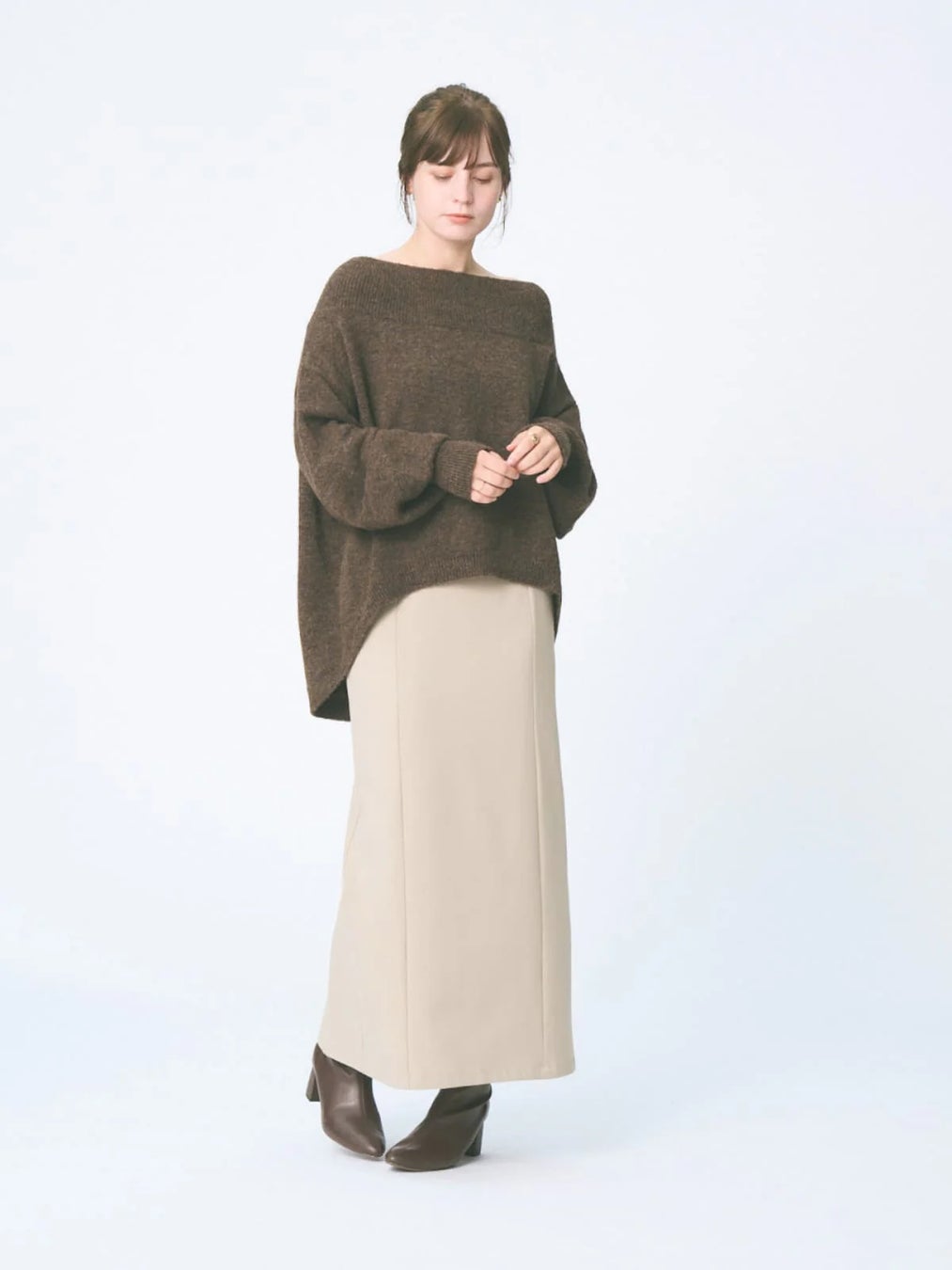 オフショルダーにもボートネック風にも変化させることができるニットプルオーバー。