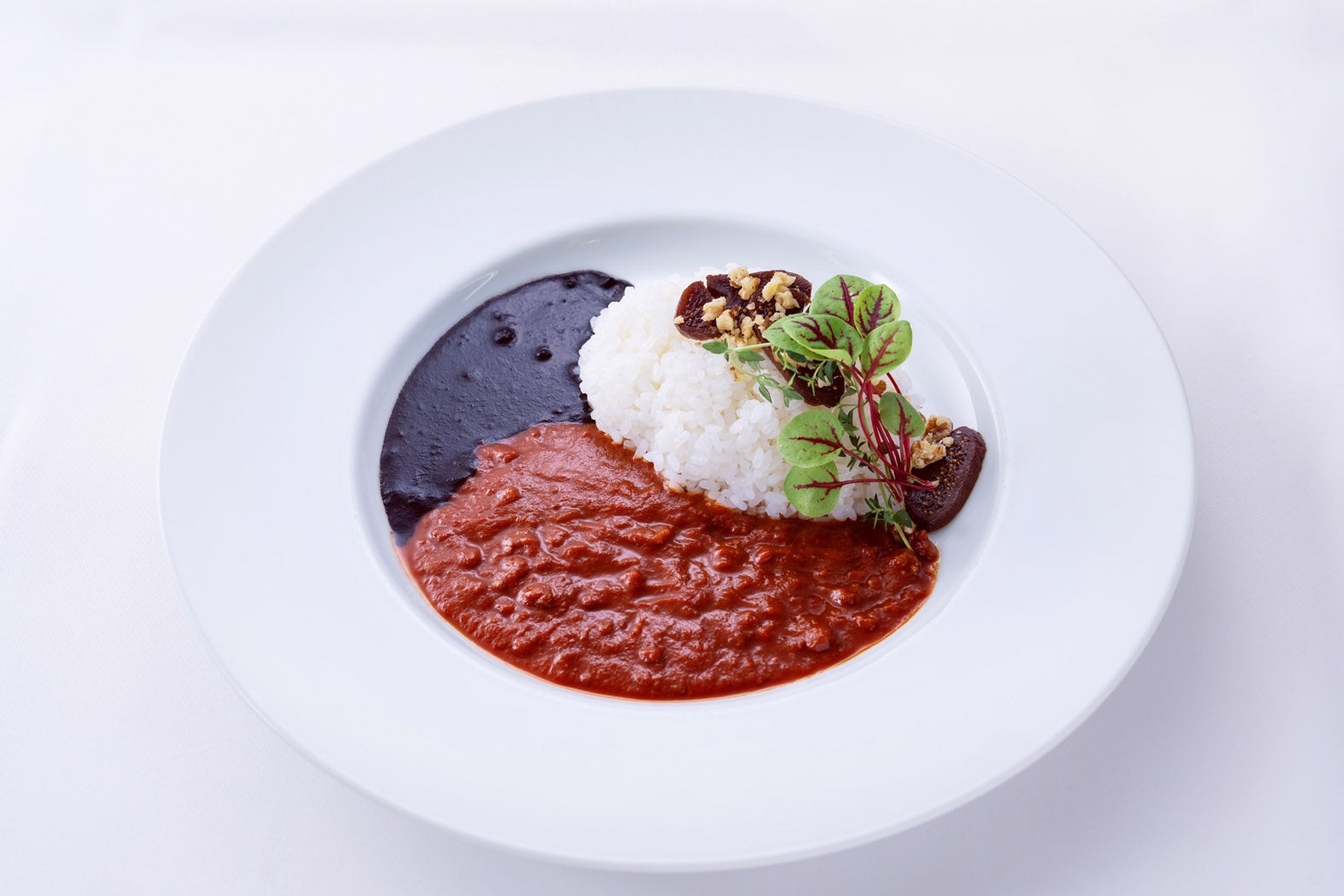 「AKA TO VEGAN KURO CURRY」は、2つのパウチに入った赤と黒の2種類のソースを混ぜながら食べる新感覚のレトルトカレー。トマト風味に大豆ミートの食感が弾む「赤」、スパイスの刺激をまろやかに包み込むビートシュガーと胡麻の香りの「黒」、いずれも植物性の素材だけで調理されており、大地の恵みが凝縮された酸味と辛味と甘味の衝撃体験が特徴です。