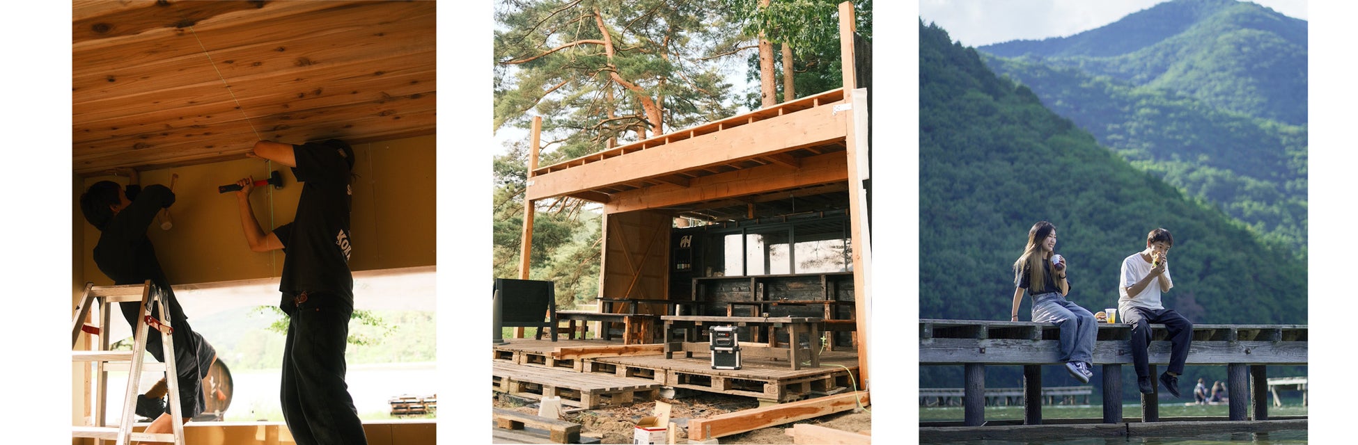 HOPPER’S CLUB.は、SAUNA STAND KOKAGE.の構想段階から温めてきた、長野県大町市にある木崎湖畔にKOKAGEヴィレッジを作るというプロジェクトの一つです。1年の歳月をかけ、地域の方々の協力を仰ぎながら、建築士や料理人、サウナ愛好家たちなど、様々な分野の仲間が集まり、議論を重ね、ひとつひとつ自分たちの手で形にしてきました。