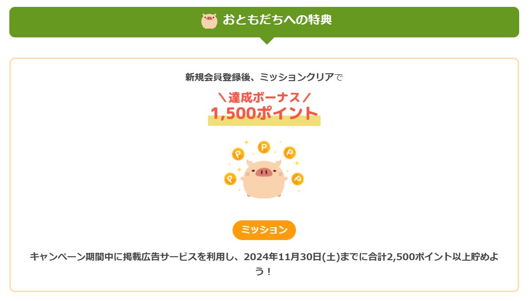 キャンペーン期間中に掲載広告サービスを利用し、2024年11月30日(土)までに合計2,500ポイント以上貯めると1,500ポイントプレゼント。