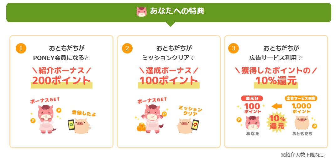 ①キャンペーン期間中におともだちがPONEYに会員登録すると紹介ボーナス200ポイントプレゼント。