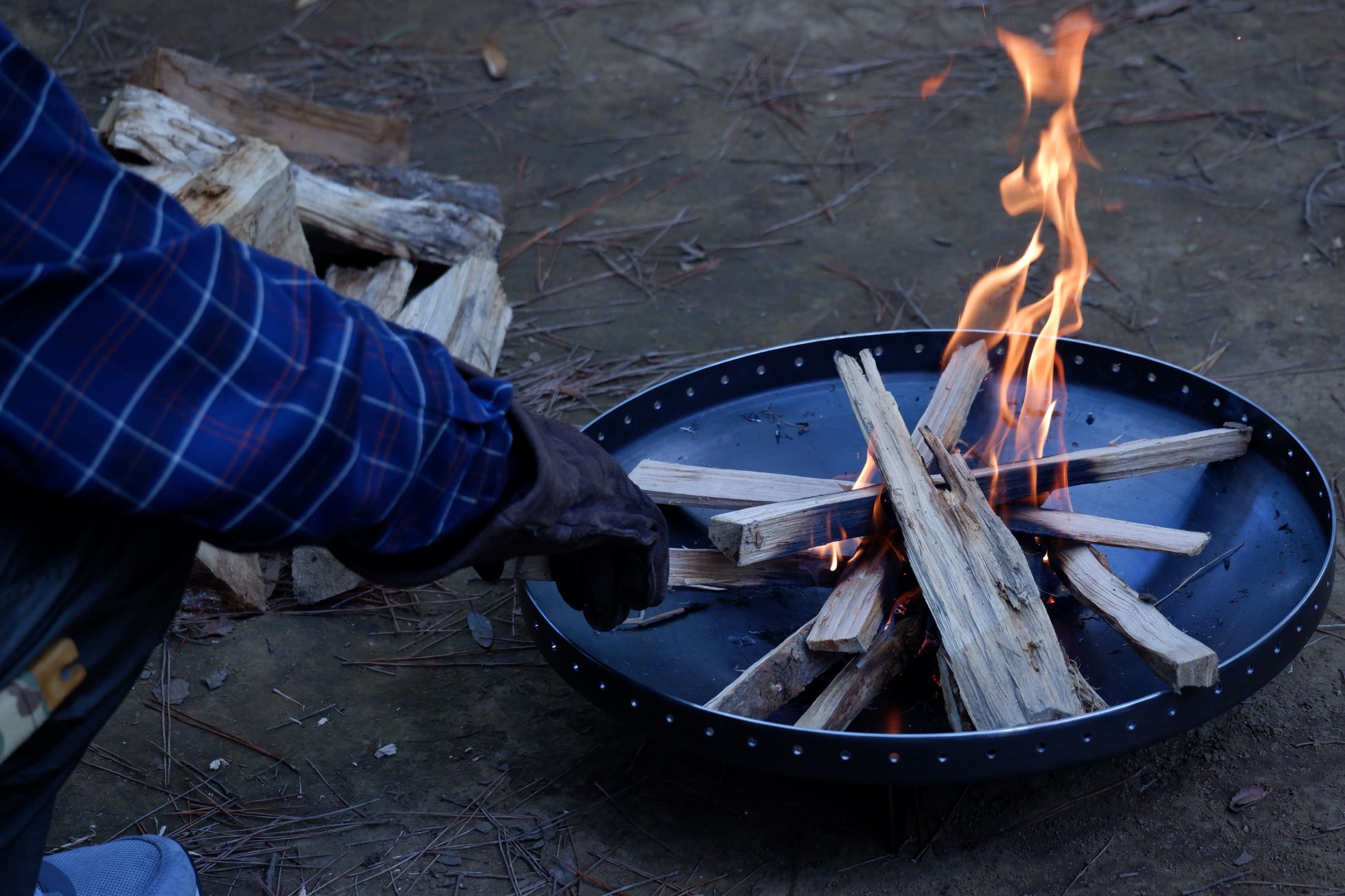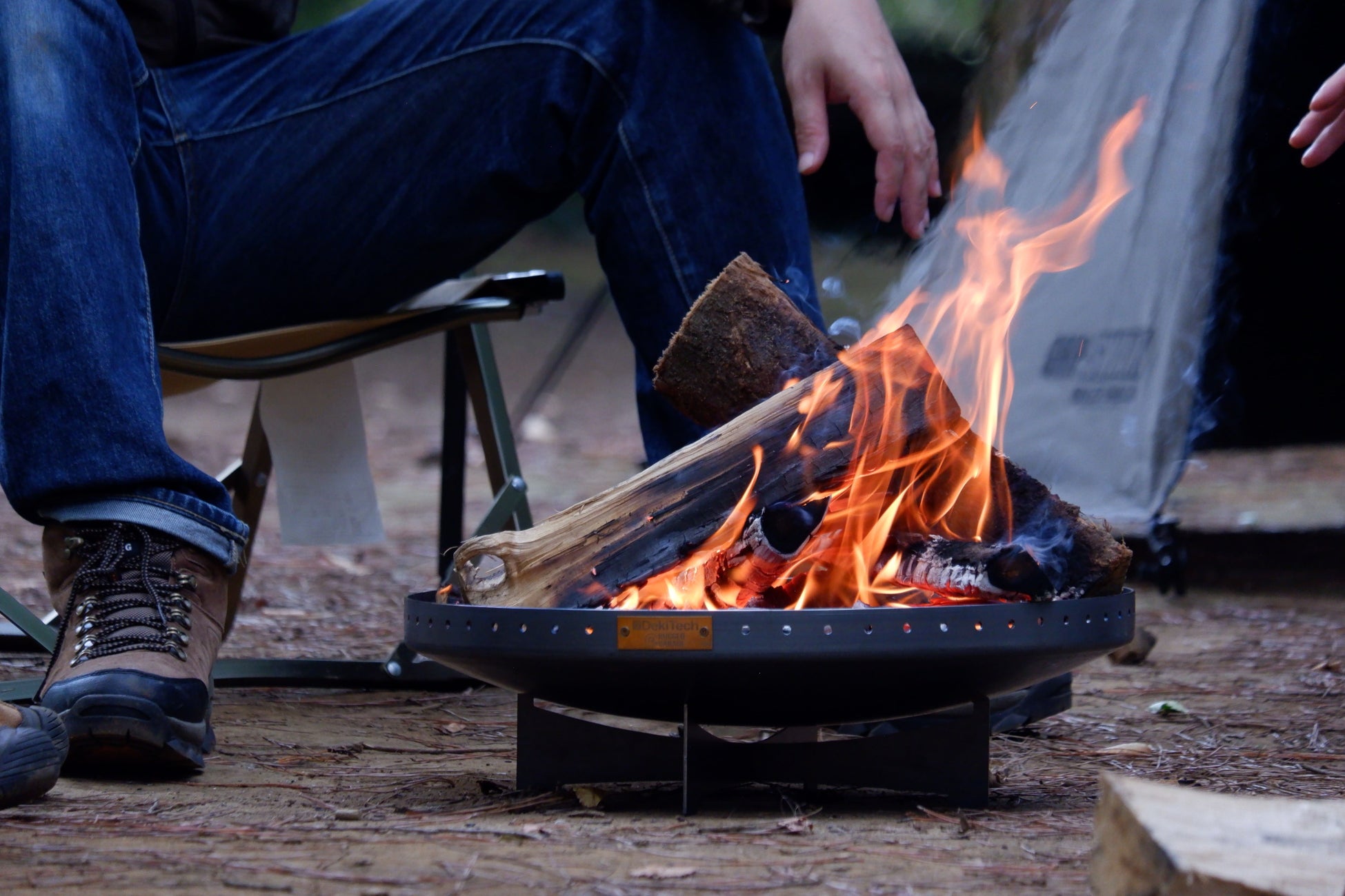 広く平らな焚き火台は、着火が簡単で使いやすく、市販の40cmの薪をそのまま豪快に投入できます。焚き火の炎が勢いよく燃え上がり、本来の焚き火の迫力を存分に楽しむことが可能です。