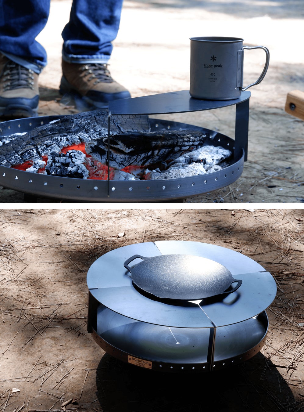 火の上に設置可能なテーブルで、料理の保温やマグカップを置くのに最適です。