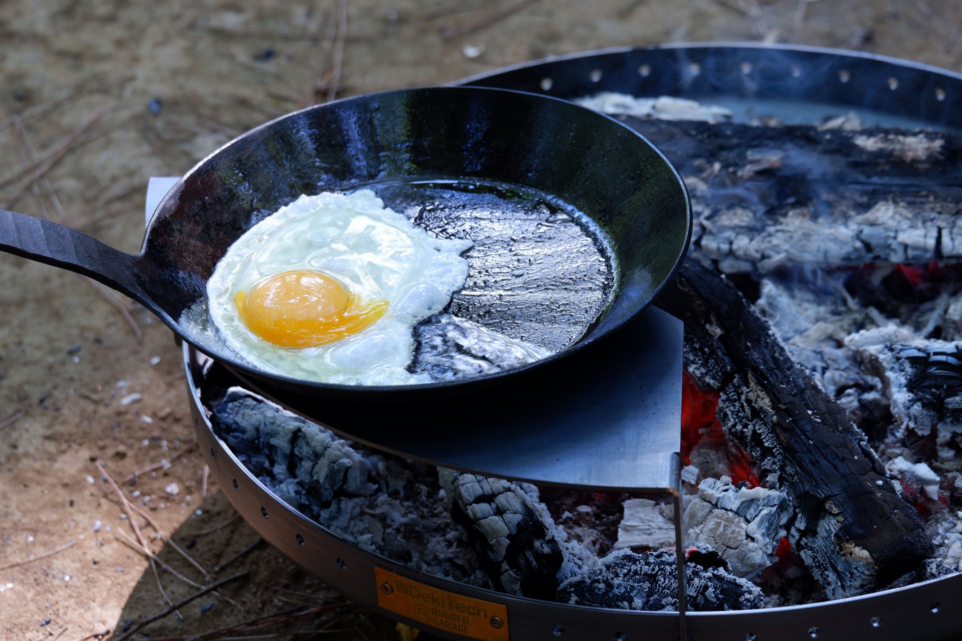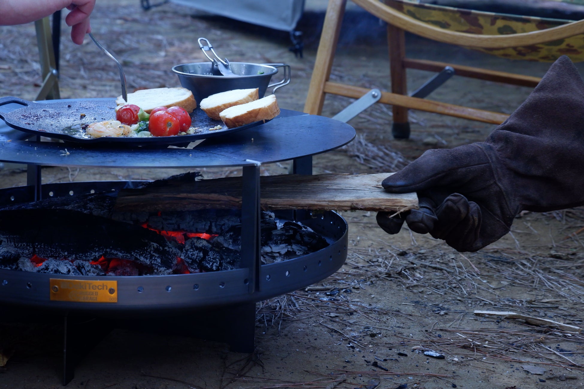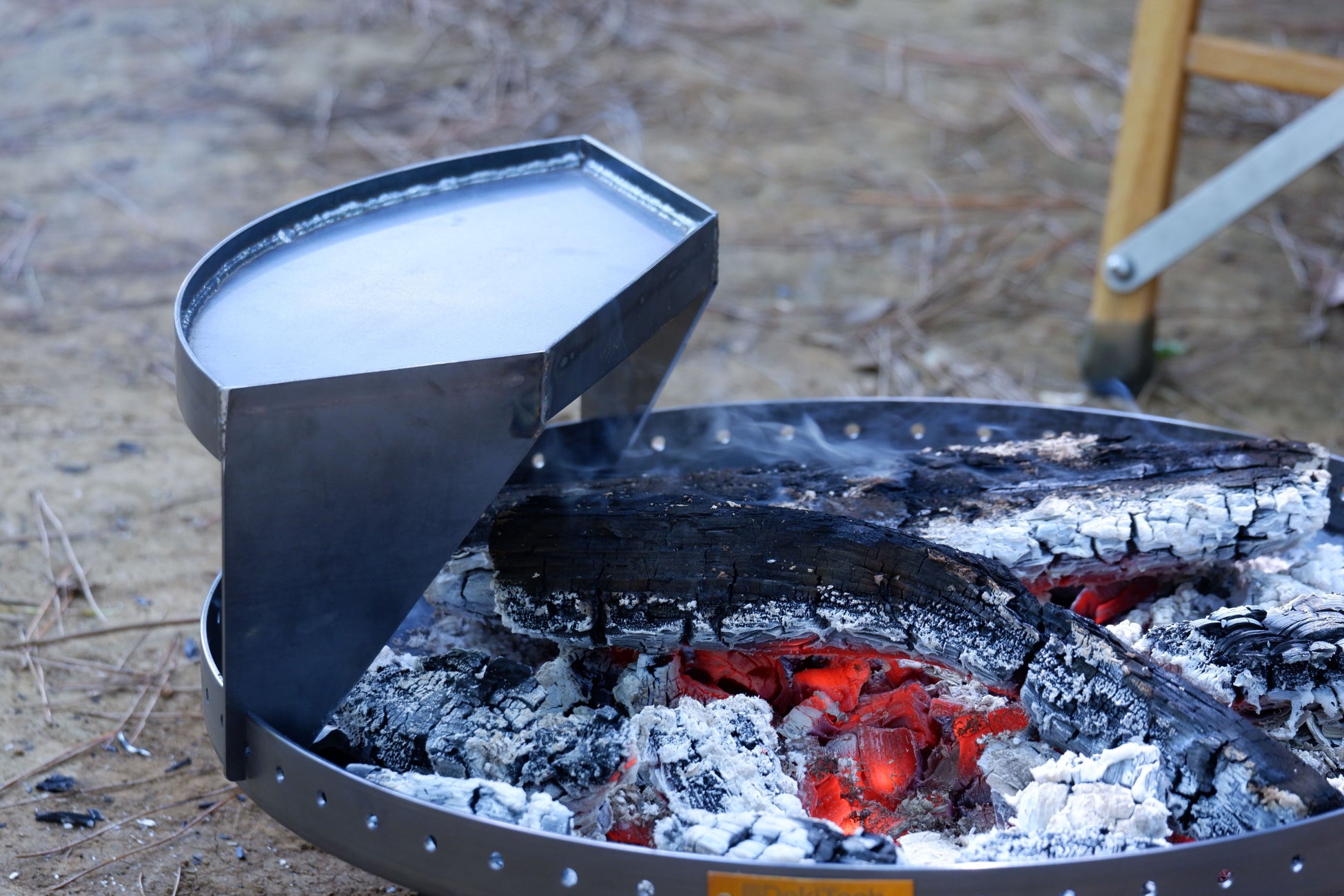 炎満テーブルより低めの設計で、熱くなる鉄板を利用してケトルでお湯を沸かしたり、フライパンやスキレットを使った調理が可能です。
