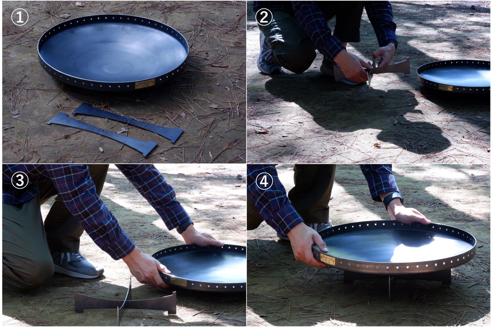 焚き火台の台座は、付属の鉄板をクロスさせるだけで設置可能。シンプルな構造により、組み立ても片付けも手軽に行えます。アウトドアの楽しさを損なわない、ストレスフリーな設計です。