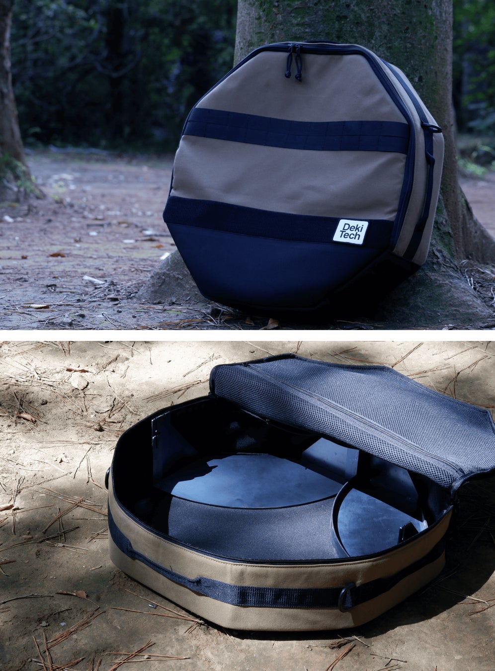 DekiTechオリジナルの特製収納バッグは、ファスナーを開けて上から簡単に収納するだけ。片手での持ち運びが可能です。