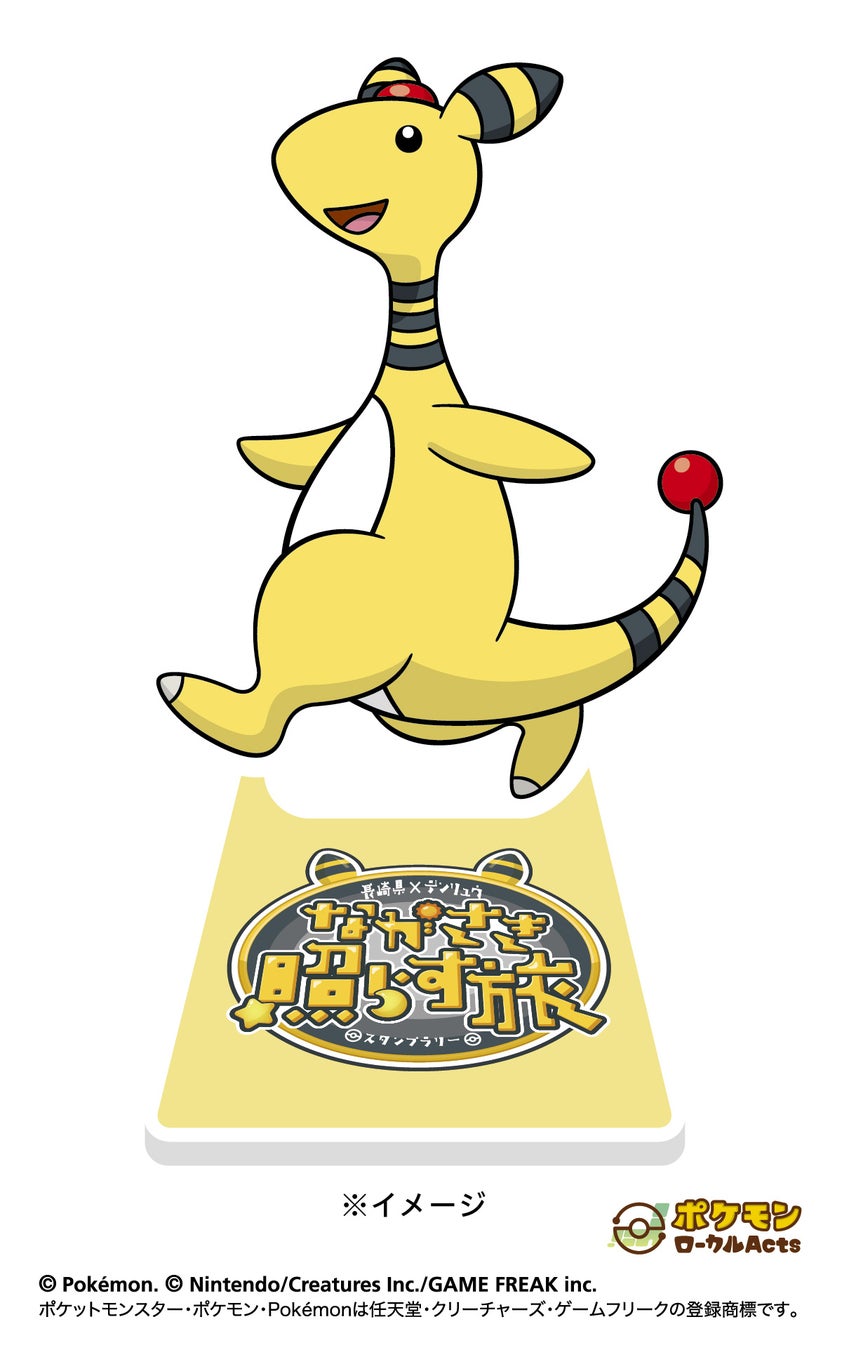 期間中、先着でオリジナルアクリルスタンドもプレゼント。アクリルスタンドは、デンリュウのデザインを使用した限定グッズです。参加者は、長崎市総合観光案内所などの県内5施設で、スタンプが2個以上押されたスマートフォンの画面を提示することで受け取ることができます。(詳細は、今後特設サイトにて公表予定)