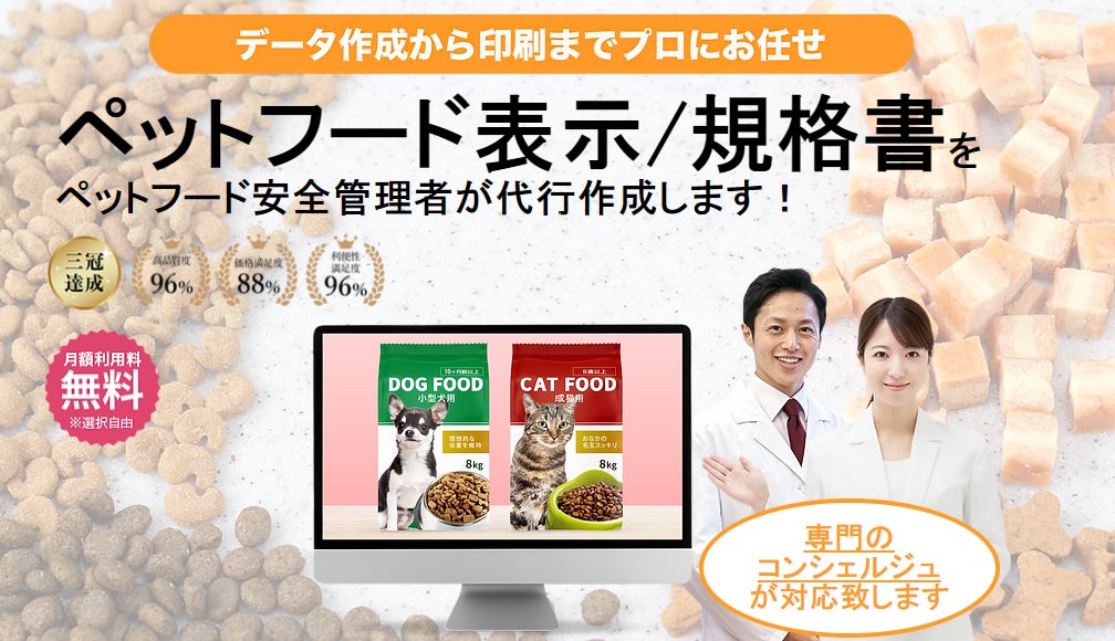 実務経験豊富なペットフード安全管理者の有資格者がペットフードの表⽰項⽬を作 成いたします。納品後のペットフード安全法法改正も⾃動サポート対応します。強 調表⽰・機能性表⽰・栄養機能性チェックにも対応しているため総合的にご利⽤い ただけます。