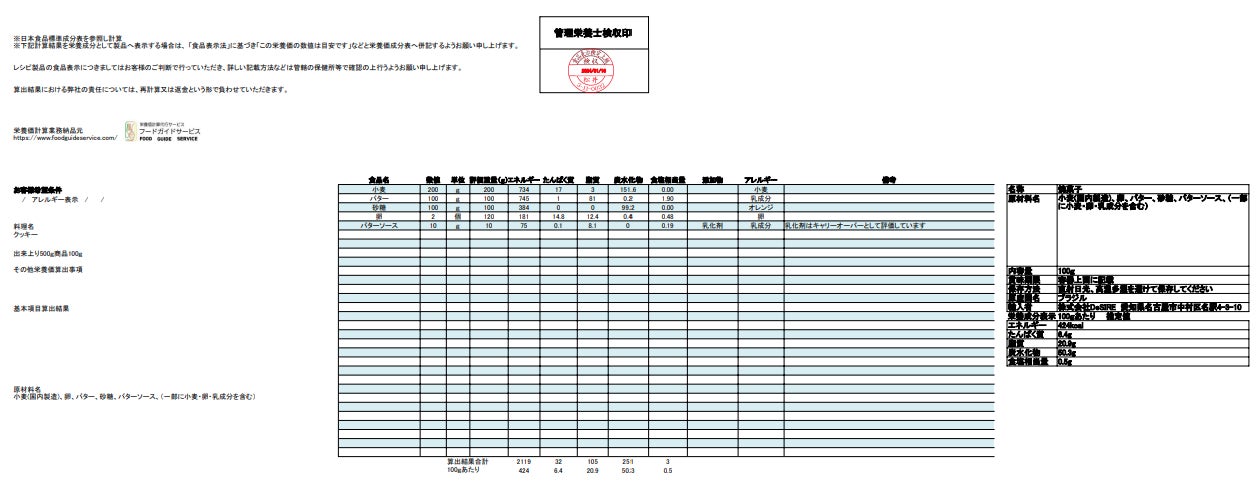 外国語の⾷品規格書を基に、⽬的国の添加物・原材料の項⽬の使⽤基準事前調査・⾷品表⽰ラベル変換を⾏うサービスです。