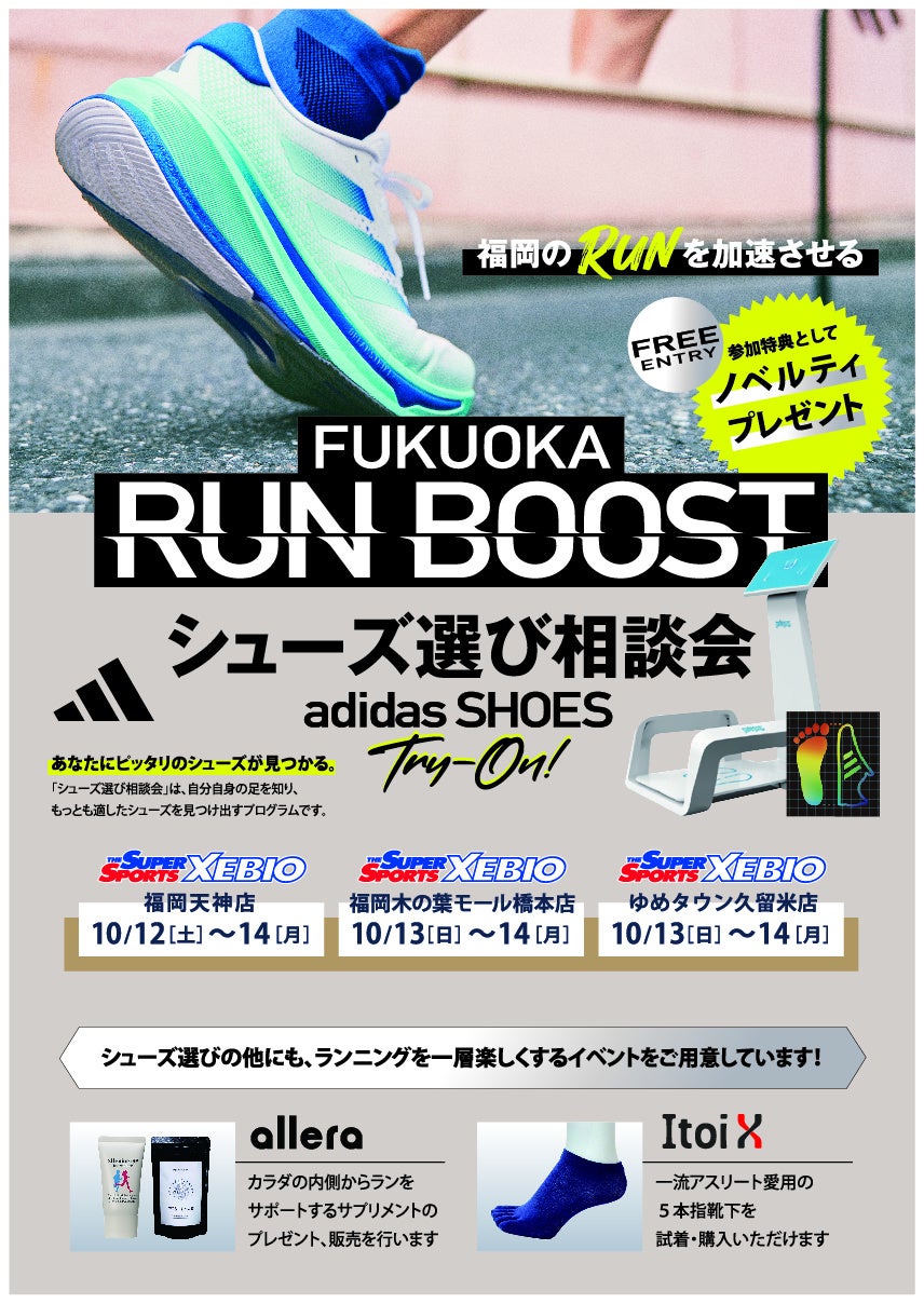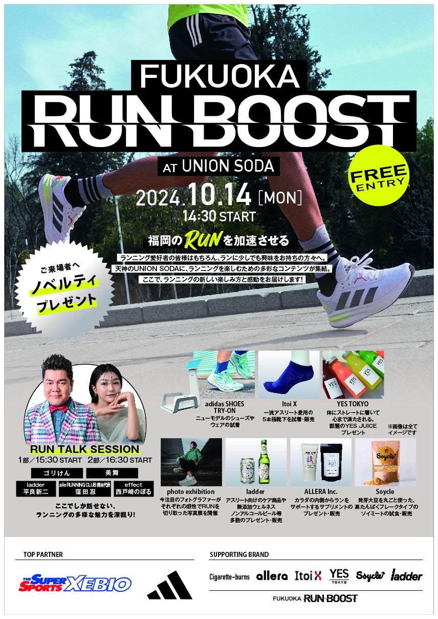 FUKUOKA RUN BOOST実行委員会(企画/制作:株式会社JOINTONE)は、2024年10月12日(土)〜14日(月/祝)に、スーパースポーツゼビオ福岡主要3店舗にてアディダスシューズの試し履きポップアップイベントと10月14日(月/祝)福岡天神「UNION SODA」にて写真展示・ゲストトークショー・RUN MUSICパーティー『FUKUOKA RUN BOOST』(以下、FUKUOKA RUN BOOST)を期間限定で開催することが決定しましたのでお知らせします。尚、スーパースポーツゼビオ福岡主要3店舗イベント・UNION SODAイベントいずれも入場無料です。来場参加者には特典プレゼントがございますので、お見逃しなく!