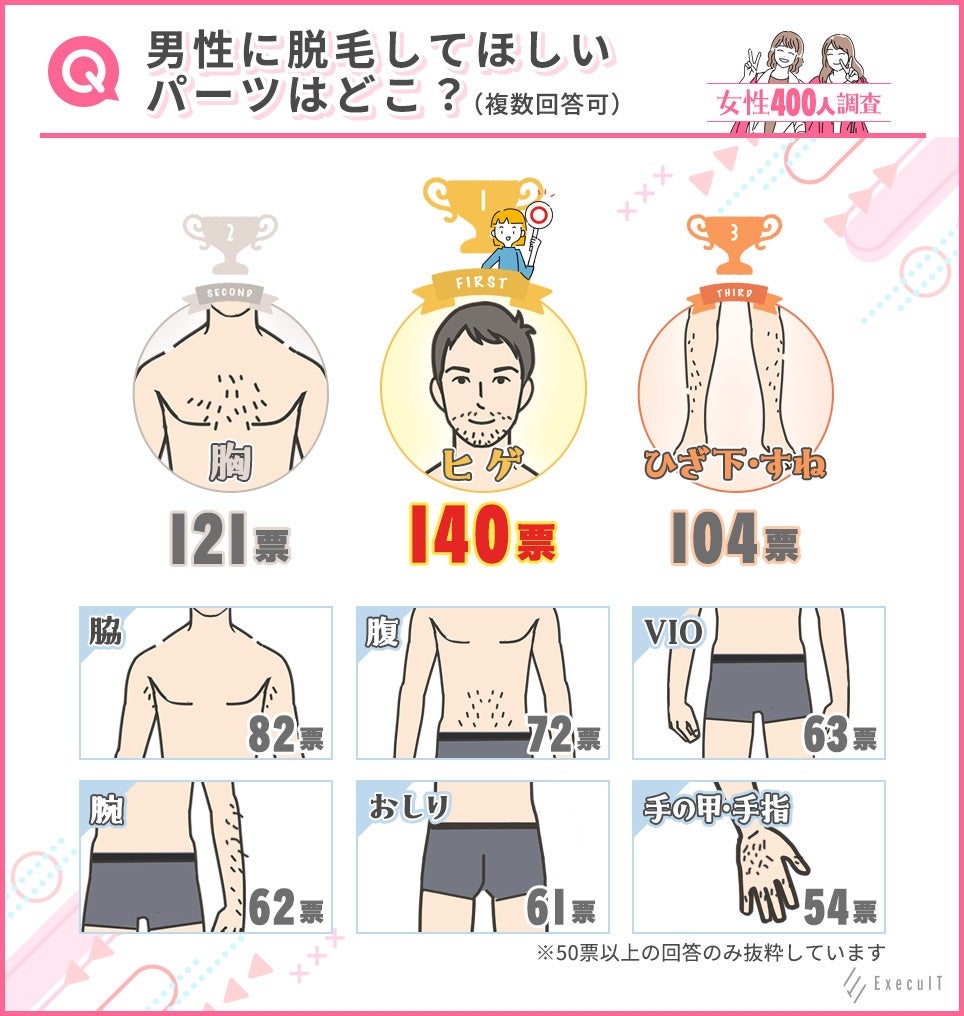 男性にメンズ医療脱毛を行ってほしいパーツを女性400人にリサーチしてみると、最も人気だったのが140票を獲得した「ヒゲ」で、「胸」「ひざ下・すね」も100票以上となっており、女性ウケが良い脱毛部位のようです。