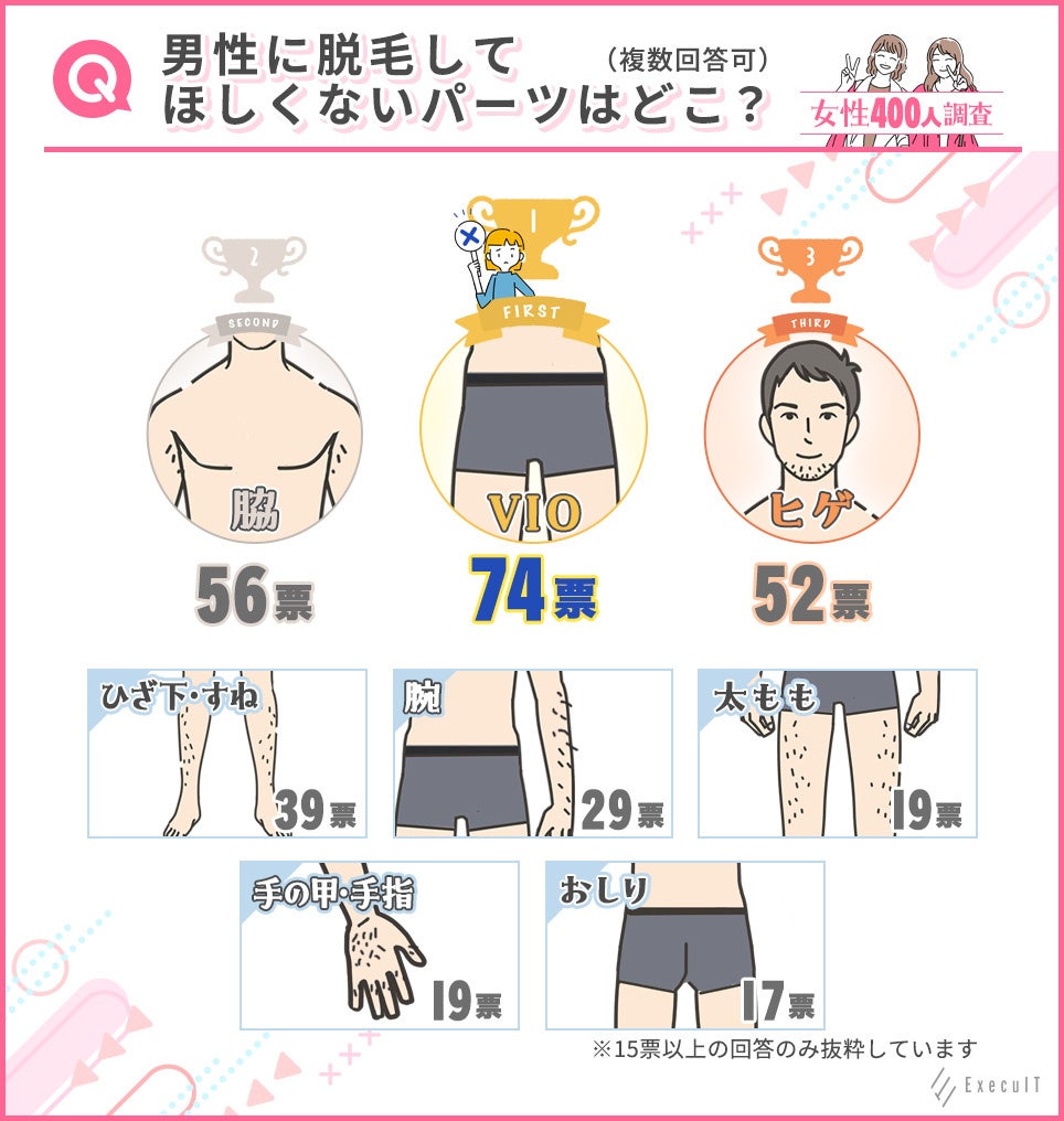また、男性に脱毛してほしくないパーツについても質問したところ、400人中74人が選んだ「VIO」が最も多く、次いで「脇」「ヒゲ」が続く結果となりました。