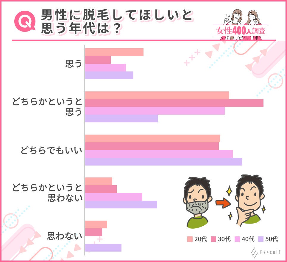 更に、男性に脱毛してほしいと思うかについての回答を20代・30代・40代・50代の年代別に分析してみると、20代・30代は「どちらかというと思う」、40代・50代は「どちらでもいい」と回答した方が多く、若い年代の女性の方がメンズ医療脱毛を推奨している人が多いということが分かりました。