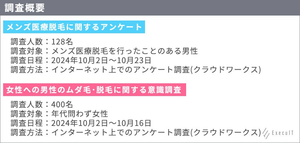 メンズ脱毛や女性の医療脱毛に関する総合情報メディアを運営している株式会社ExecuIT(https://execuit.wpx.jp)では、メンズ医療脱毛を行った経験のある男性128名を対象にアンケート調査を実施し、メンズ脱毛で後悔している男性がどの程度いるのか、後悔する理由はあるのかを分析しました。
