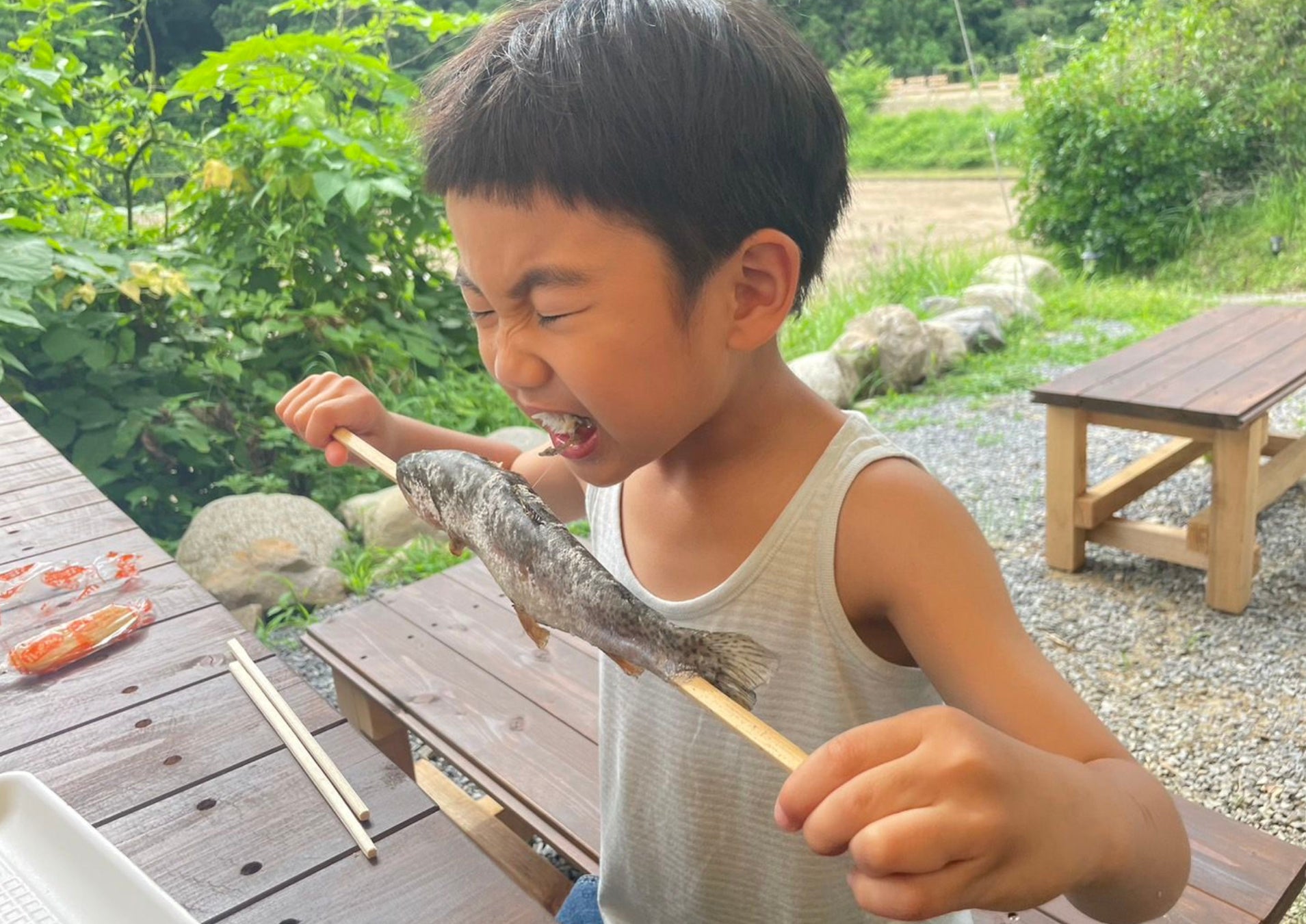 リバーベース塩瀬の最大の目玉は、自分で釣ったおさかなを自分で捌いて、塩焼きで食べる事ができる点です。