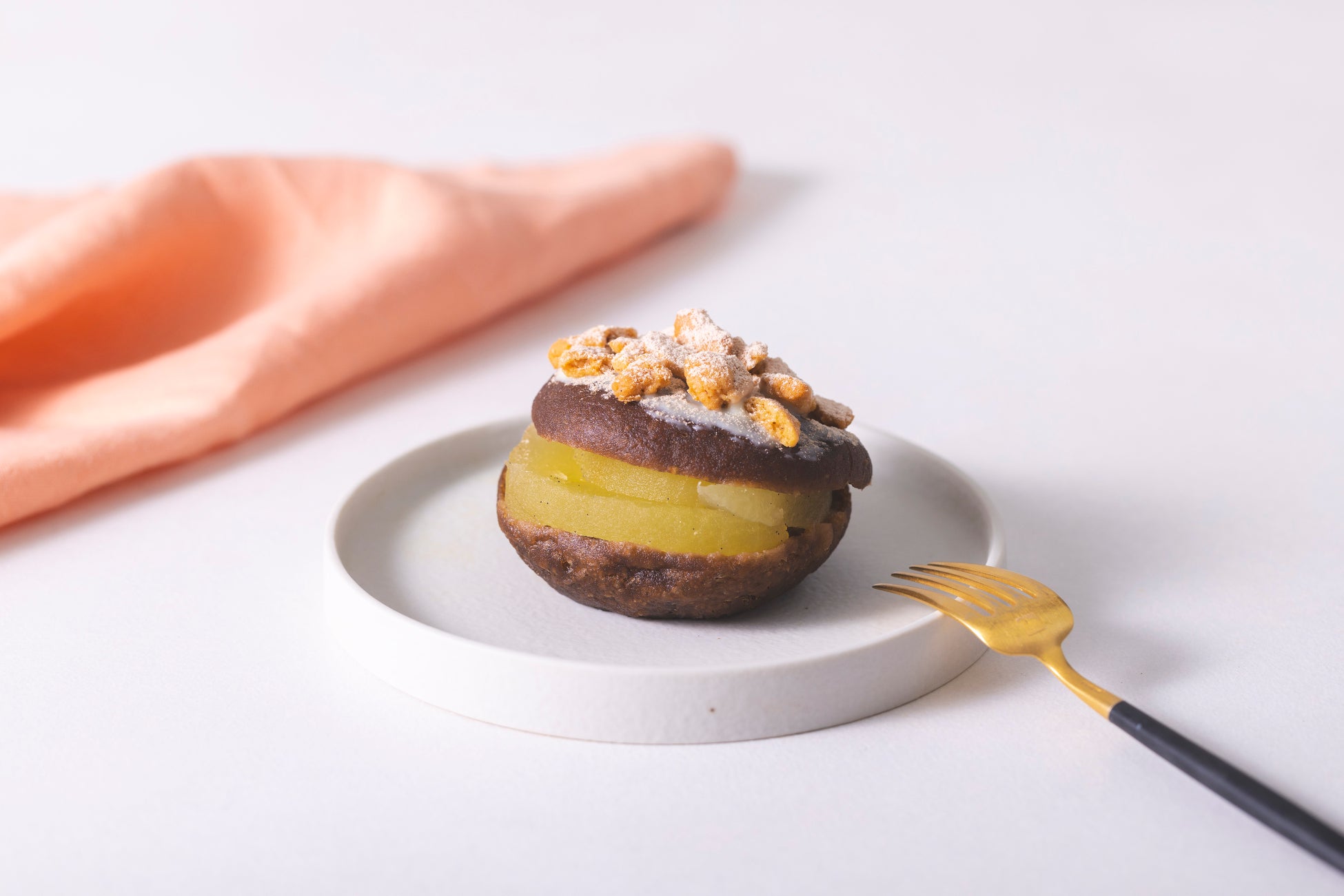 まるでアップルパイのようなパティシエのおすすめ商品。リンゴの風味やシナモンの香りをお楽しみいただけるよう中のカスタードはシンプルに仕上げています。また、食感のアクセントにザクザク食感が特徴的なクランブルをトッピングしています。