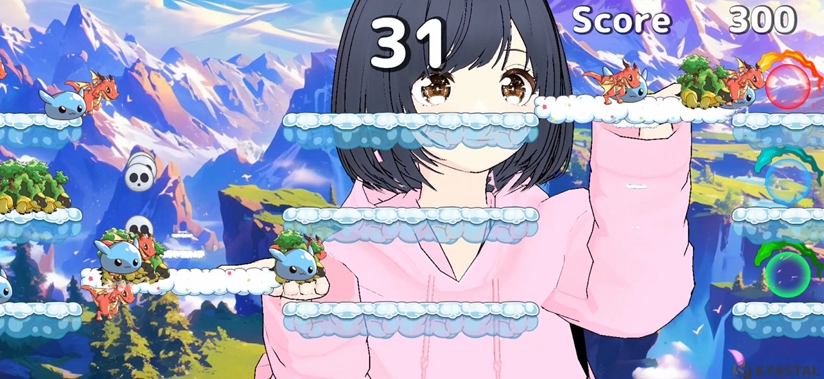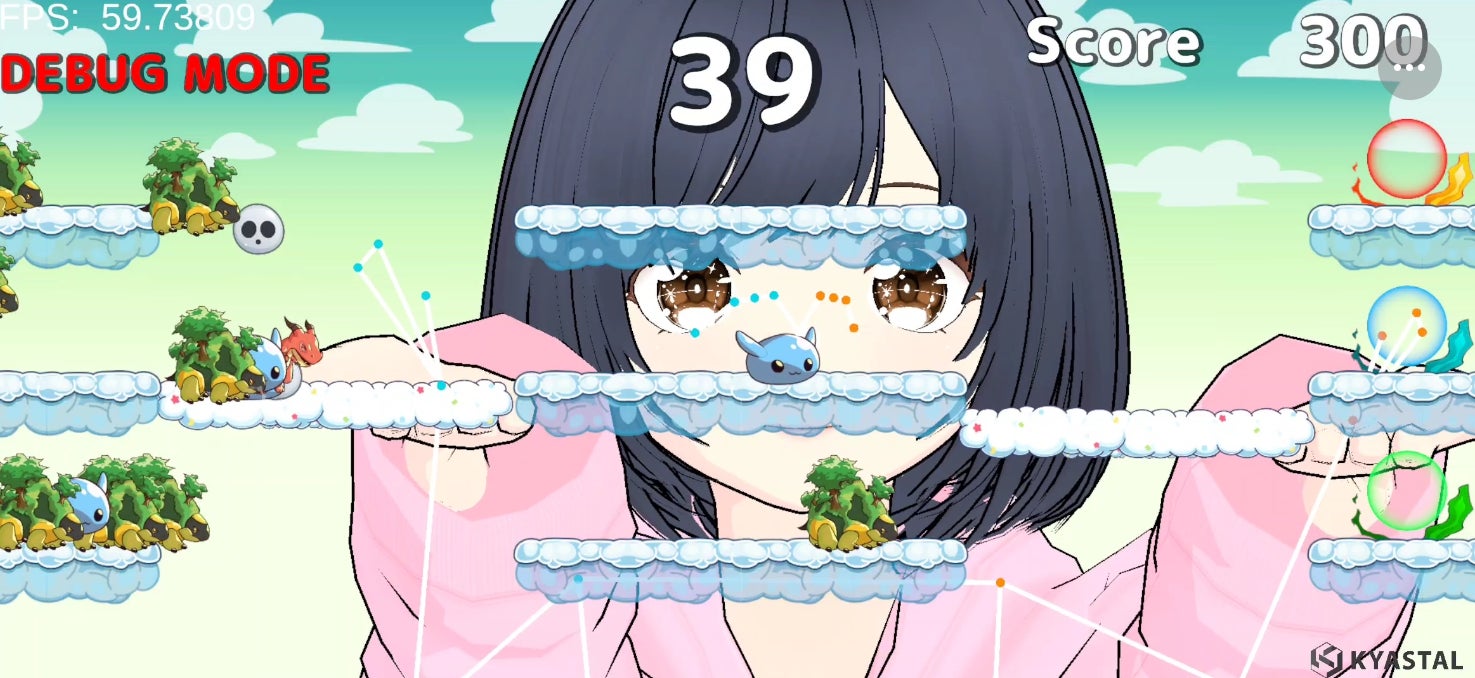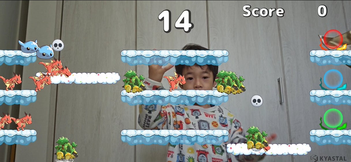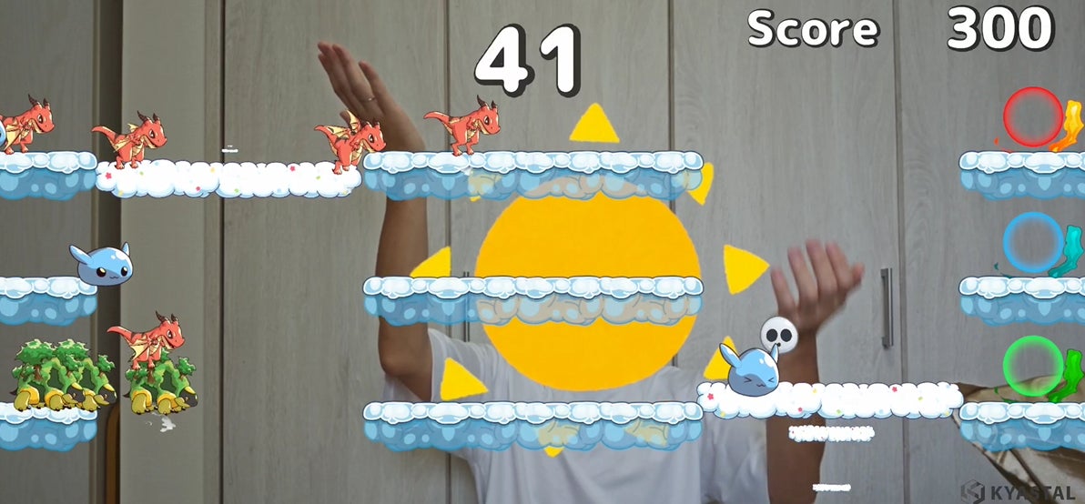 プレイヤーがカメラの前で手を上下に動かすことで、2つの床を操作することができ、モンスターの見た目と同じ色のゲートに導くことで入手できるポイントを競うゲームです。