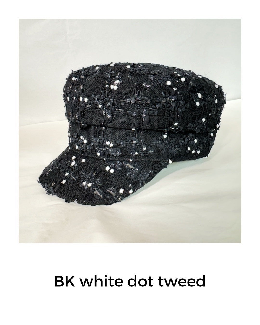 チェック柄に立体的なホワイトのフロッキードットを施したイギリス製ツイード。黒をベースにしたモノトーン配色で、シックな"大人可愛い"が叶う一品。「小顔見えする」と好評のキャスケットは、コーディネートの完成度を高め、洗練されたスタイルに仕上げます。