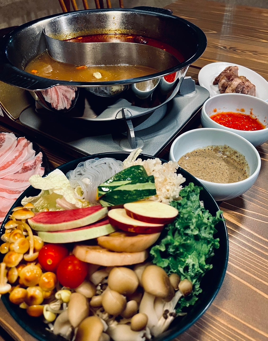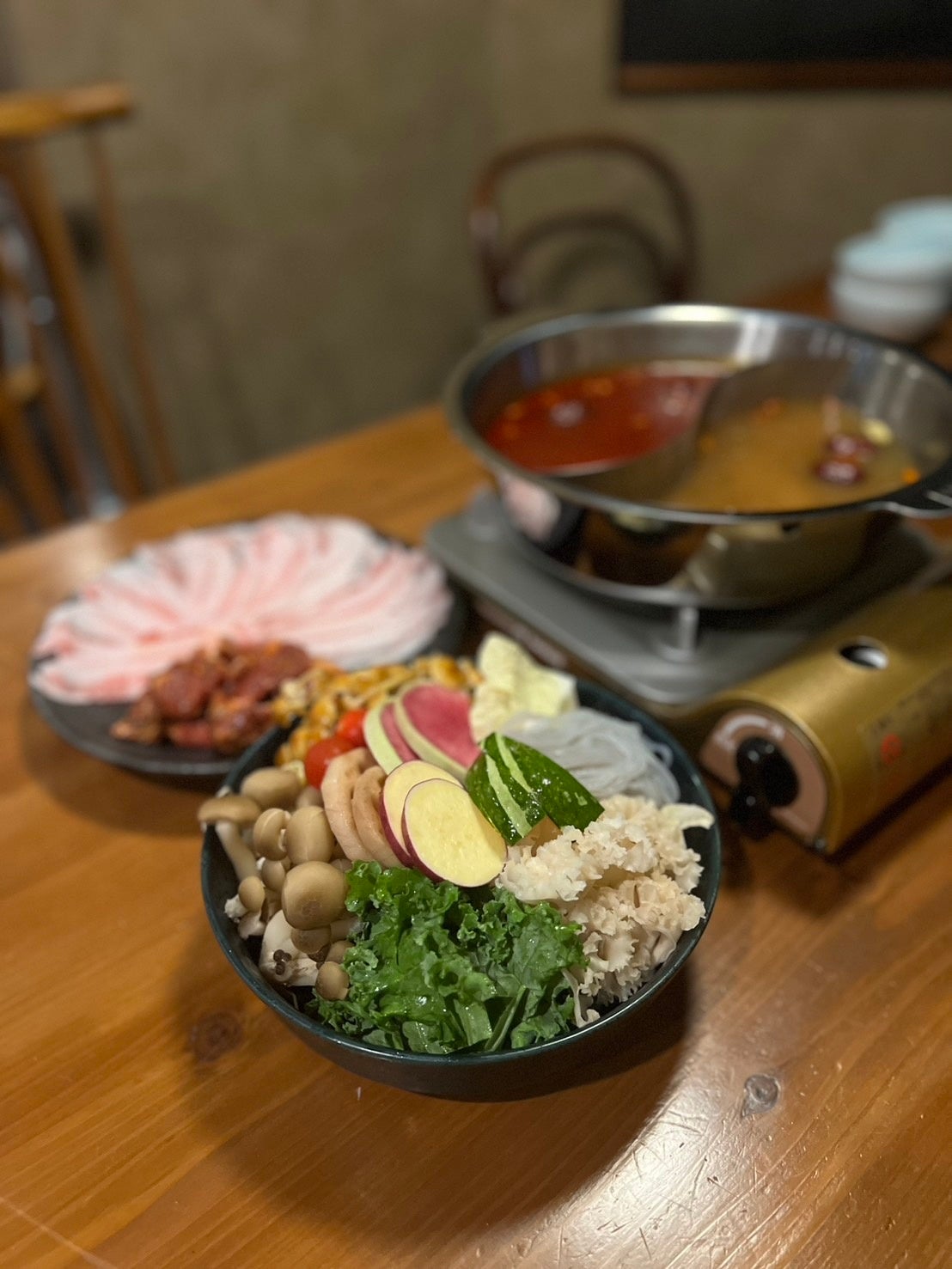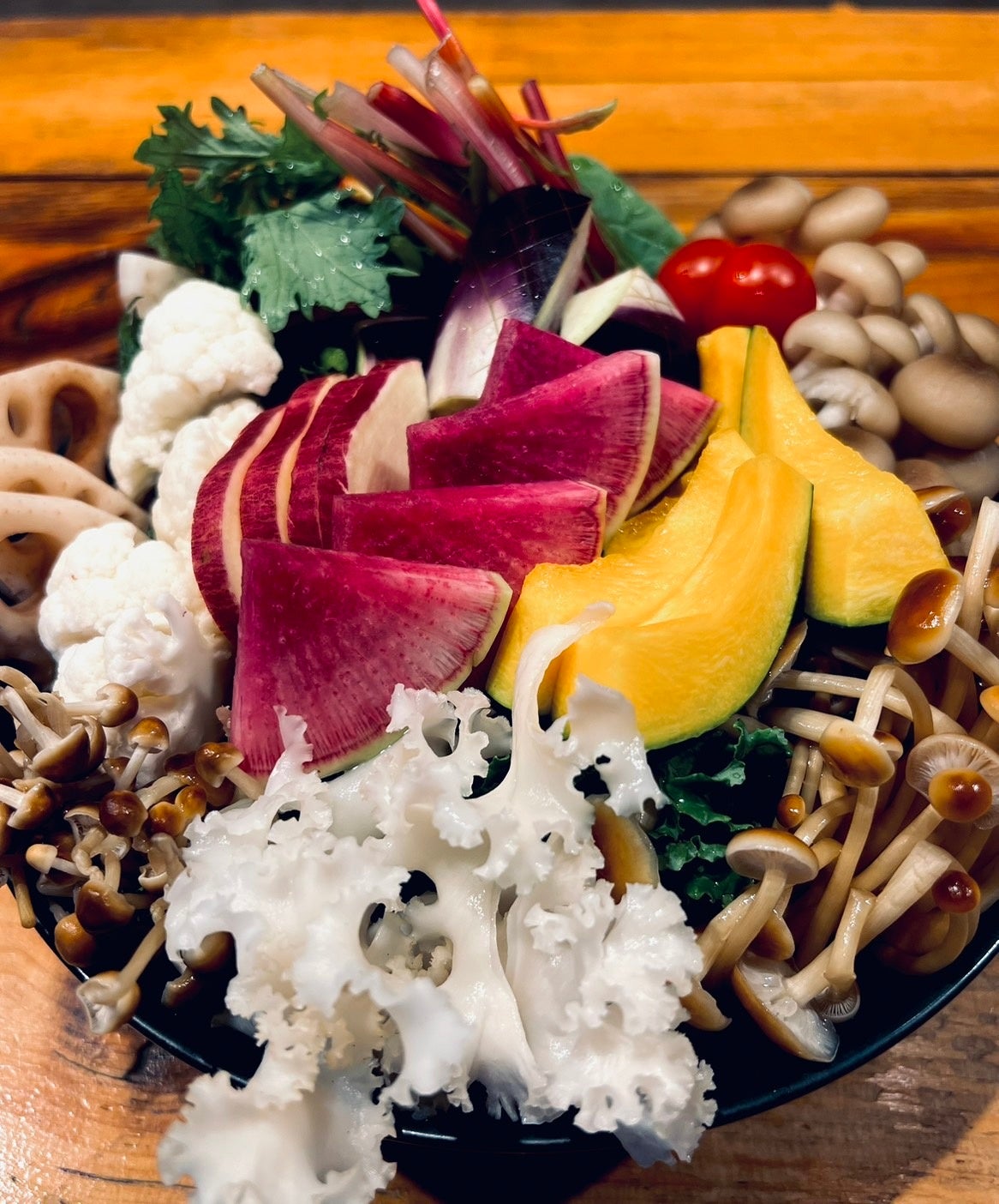 鍋の具材は「赤豚しゃぶしゃぶ肉」「麻辣牛肉」を筆頭にラムやホルモンなどをご用意。冷凍具材は使用せず、フレッシュな状態のものをお出ししています。色とりどりの野菜を美しく盛り付けた「野菜盛り」は、舌だけでなく目でもお楽しみいただけます。