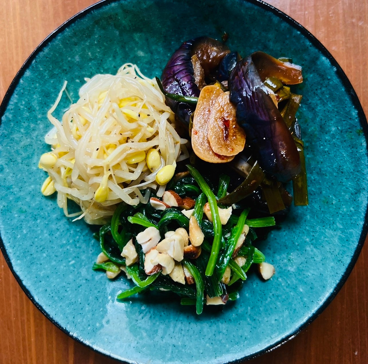 ・野菜のおつまみ盛り合わせ(茄子の南蛮漬け、法蓮草とナッツの味噌和え、里芋の葱塩炊き) 990円